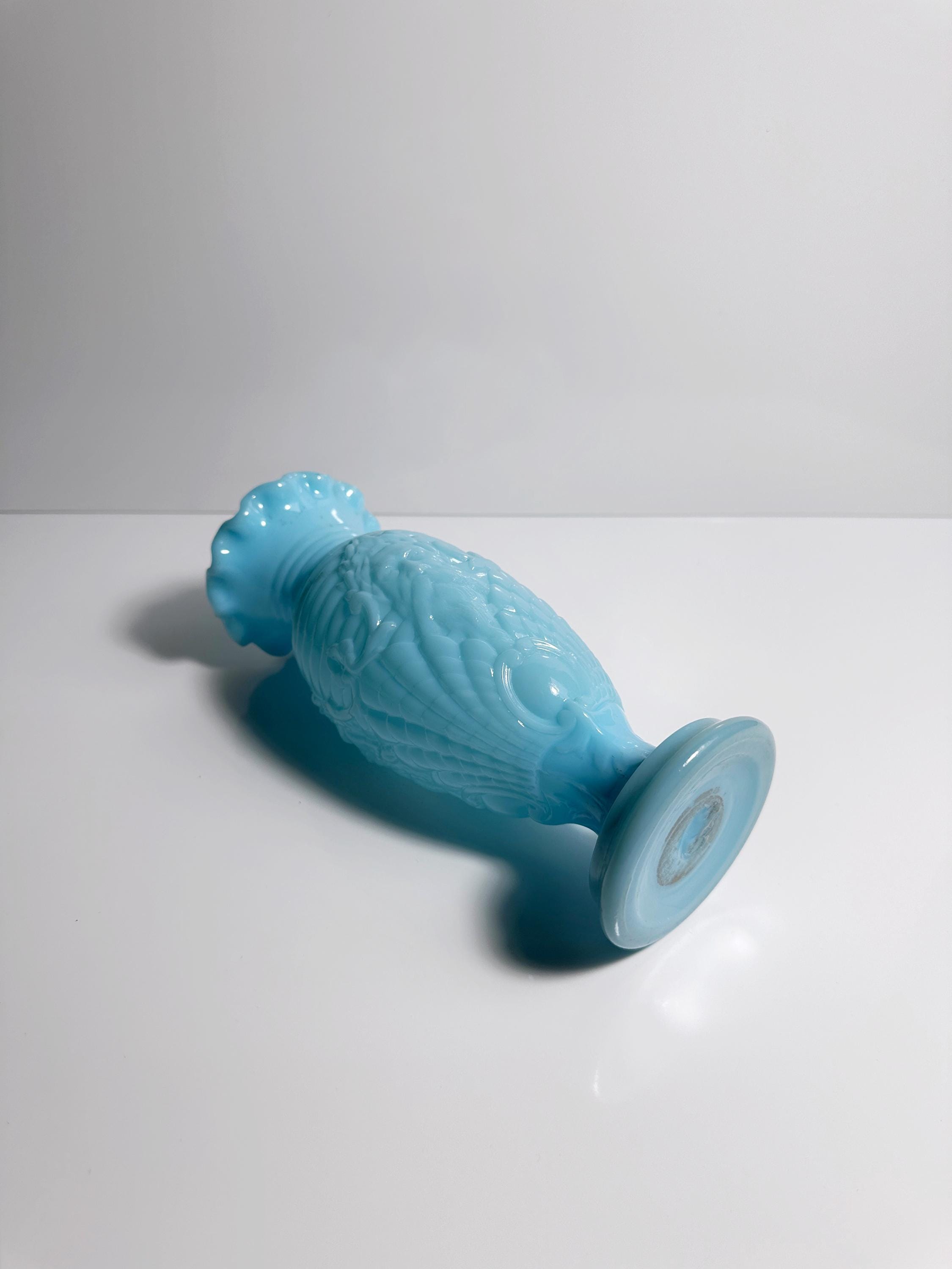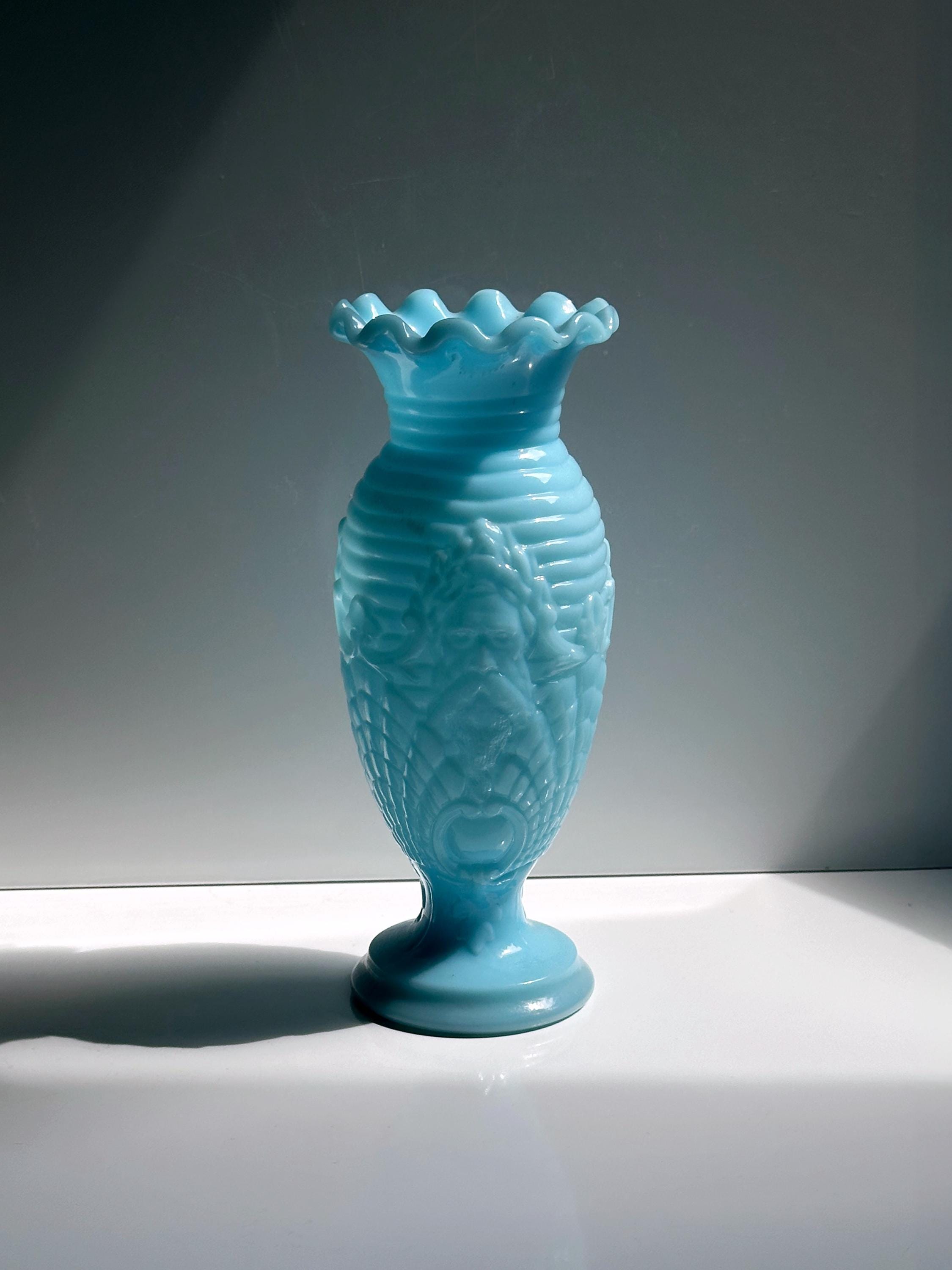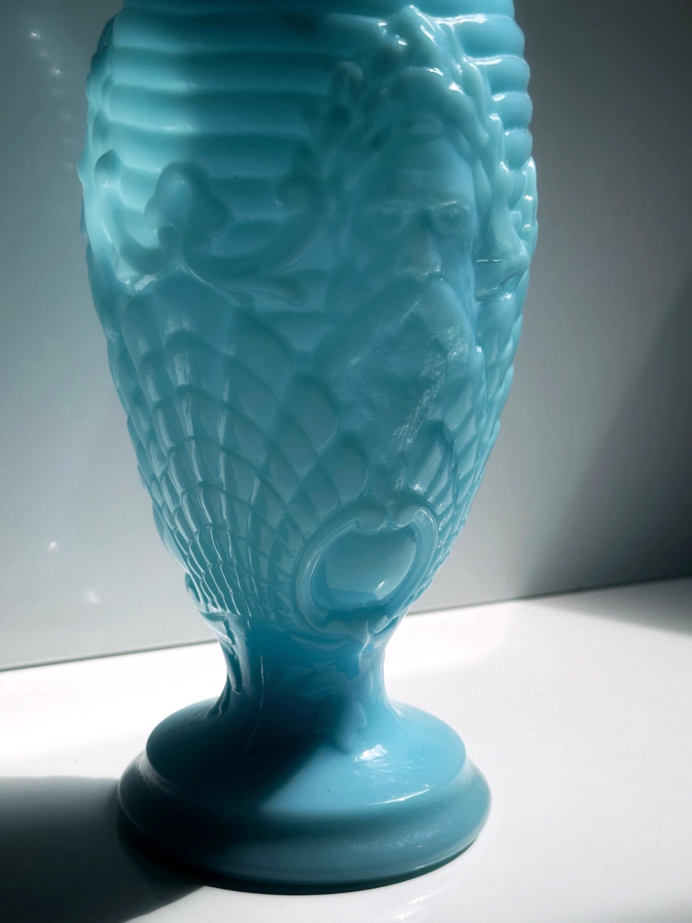 Rare Vallérysthal Opaline Vase Art Nouveau Glass 4597 Opaline Glass Milk Glass Blue Celeste 1900 1910 Portieux Neptune Poseidon Shell Nautical