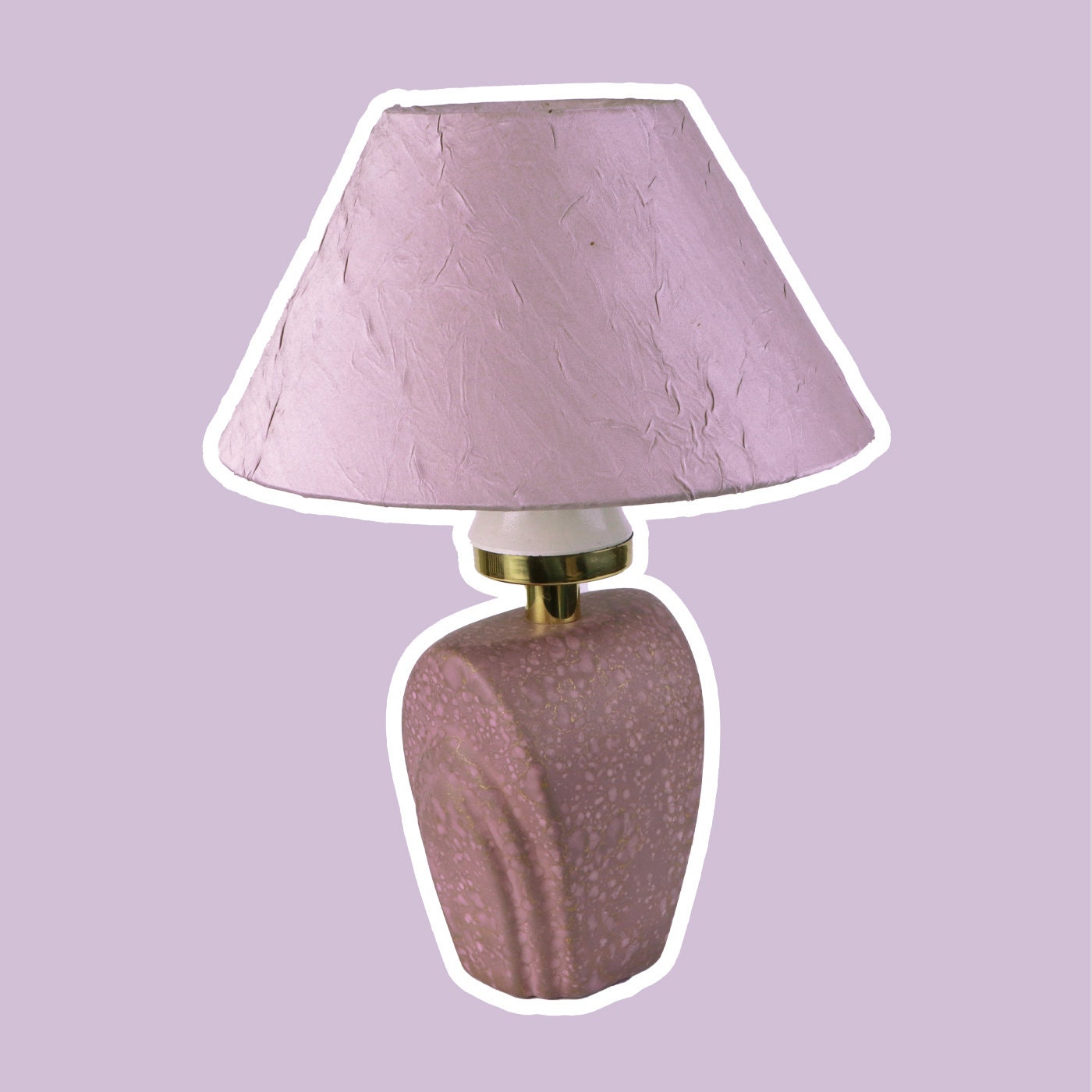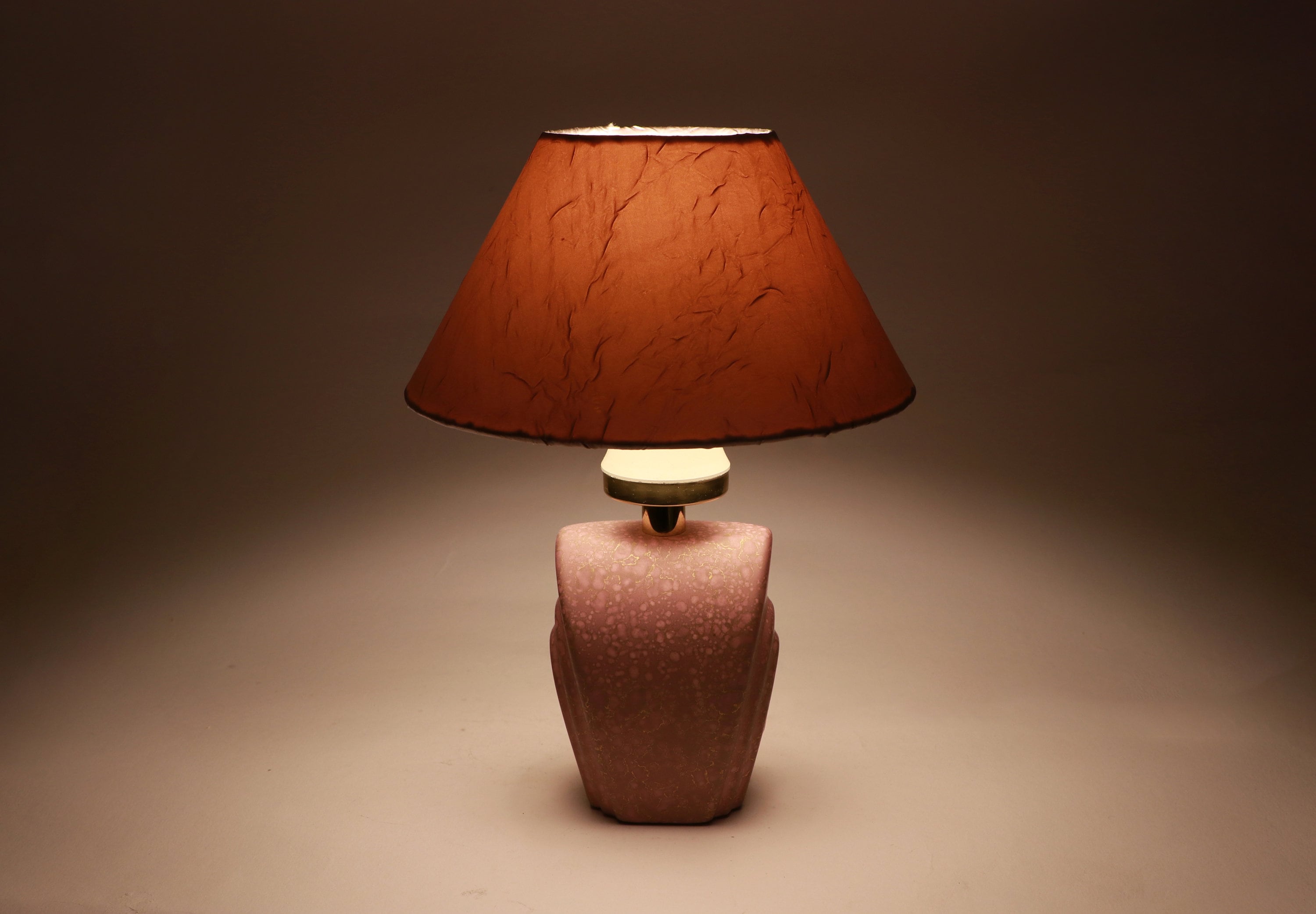 Very rare, unusual model in a fine lilac color. The base has pink and gold colored speckles, the lampshade is beautifully creped in light lilac. Makes a very nice light.