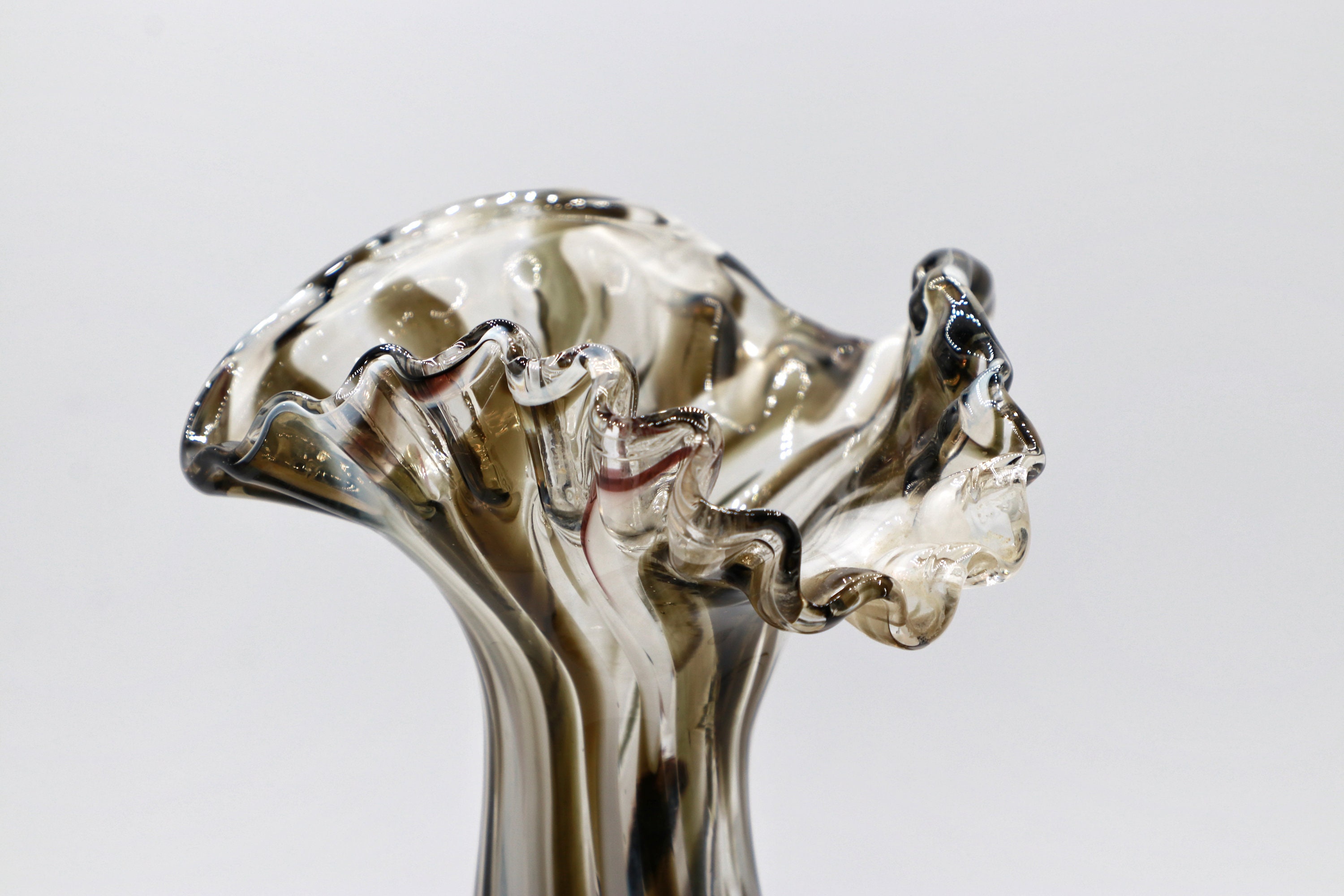 Very beautiful Murano vase in black, white and beige with beautiful marbling and wavy edge and partial violet glass inclusions.