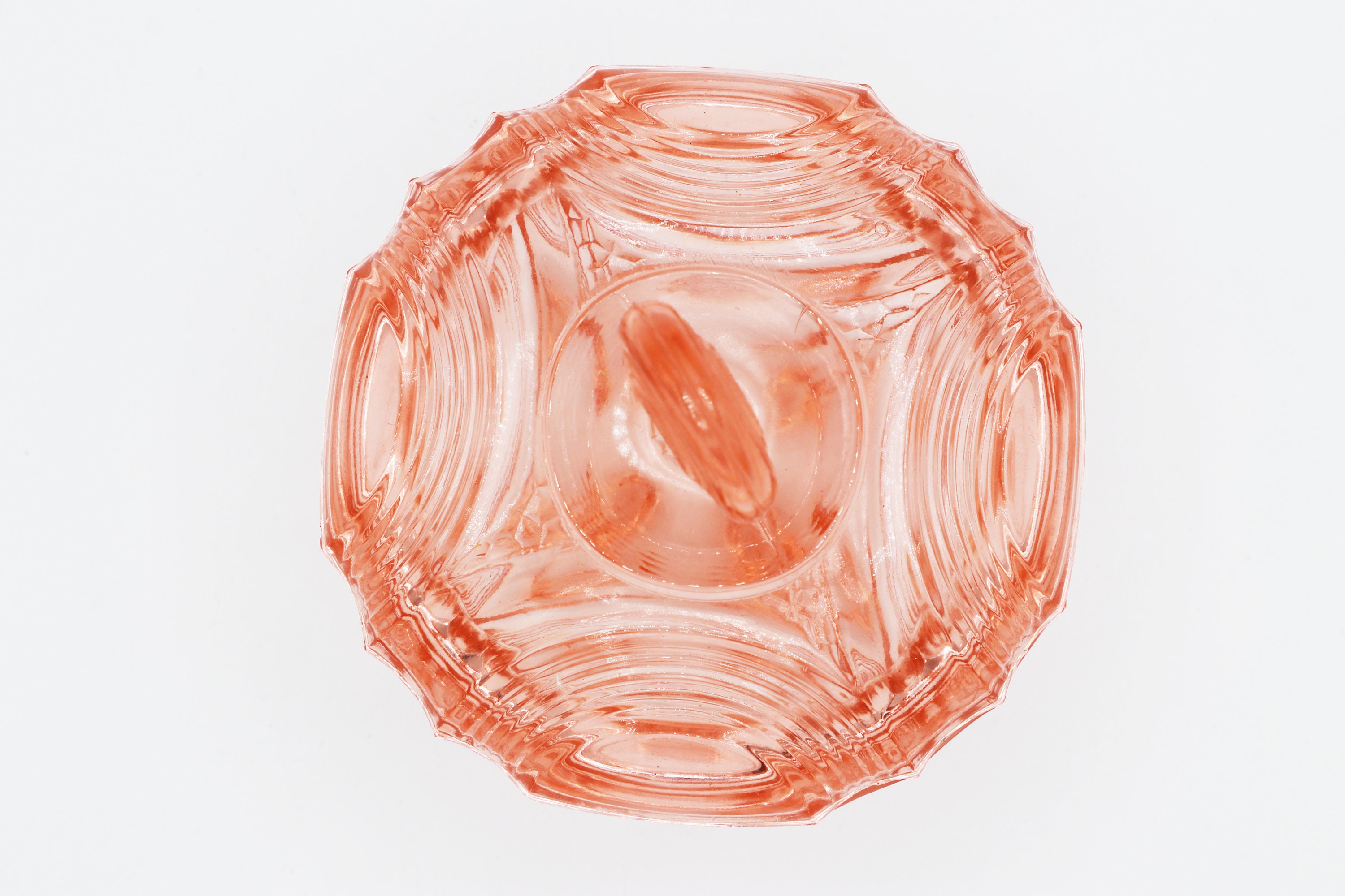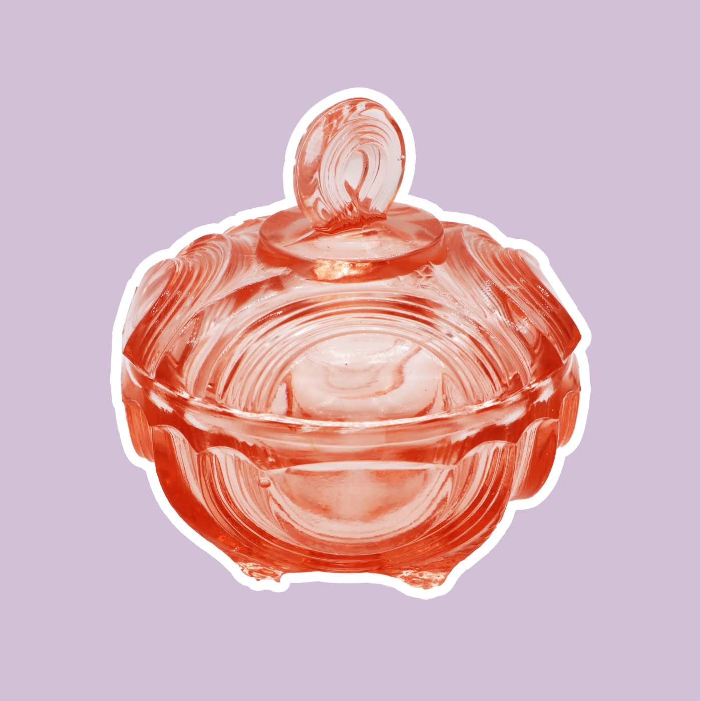 Beautiful bonbonniere / lidded box made of pink pressed glass around 1920/1930. Typical design of the time with round elements, Bauhaus tendency.