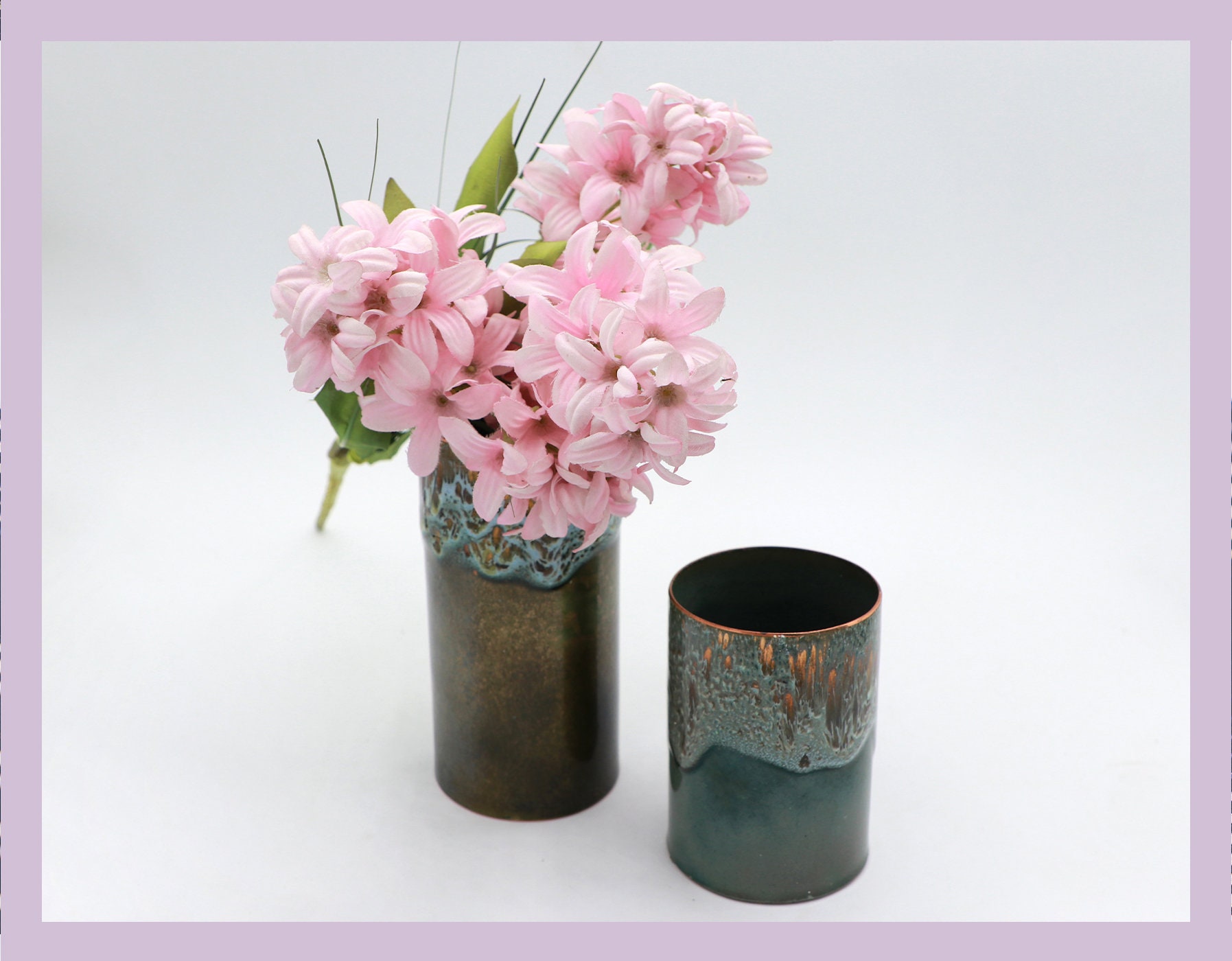 Set of vintage vases metal copper brass enamel enamelled fat lava effect gold turquoise green petrol gradient brutalist 60s 70s mid century