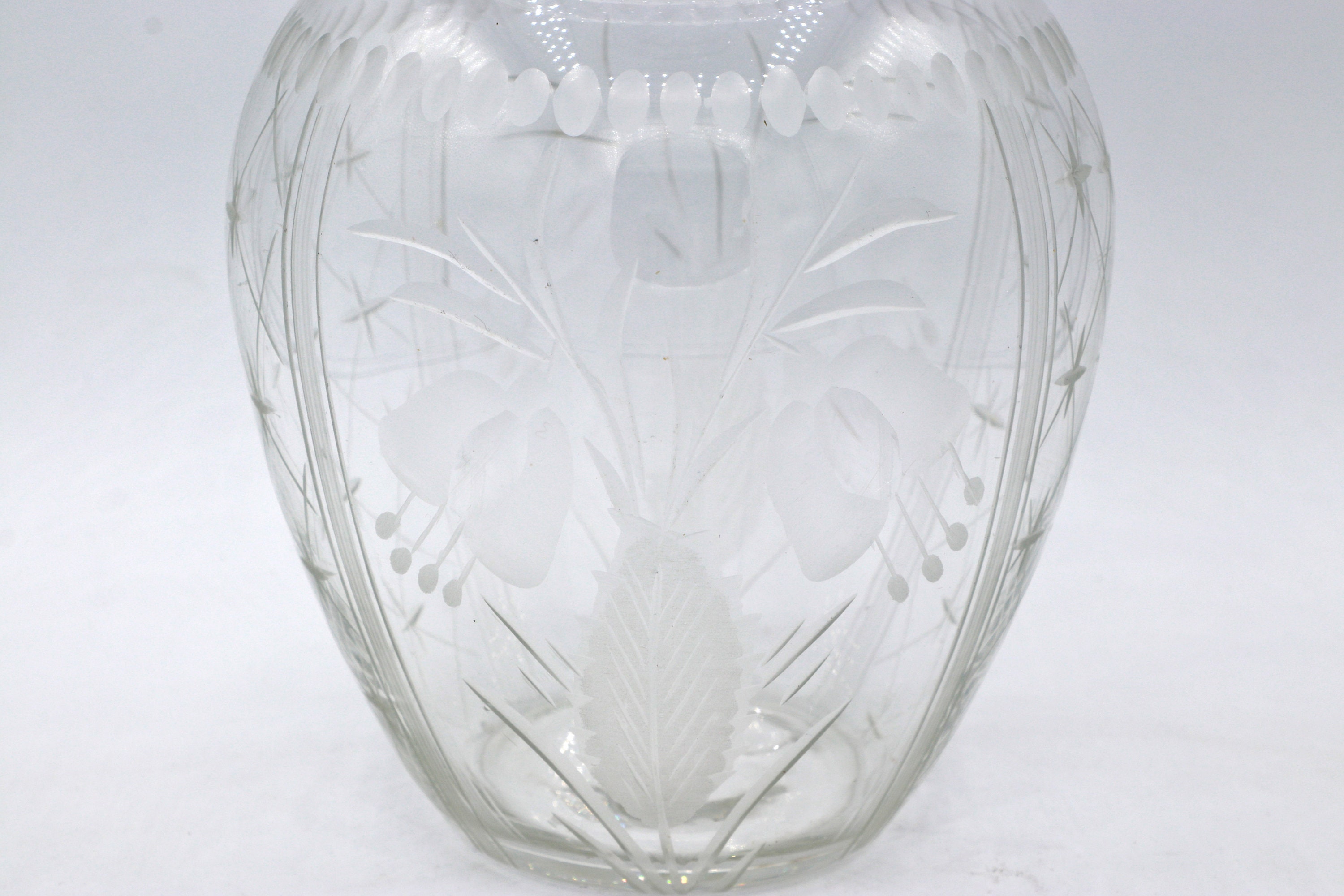 Very nice Art Deco flower vase from the 1920s / 1930s. Elaborate, hand-blown processing, time-typical design language with ground-in lines and floral elements.