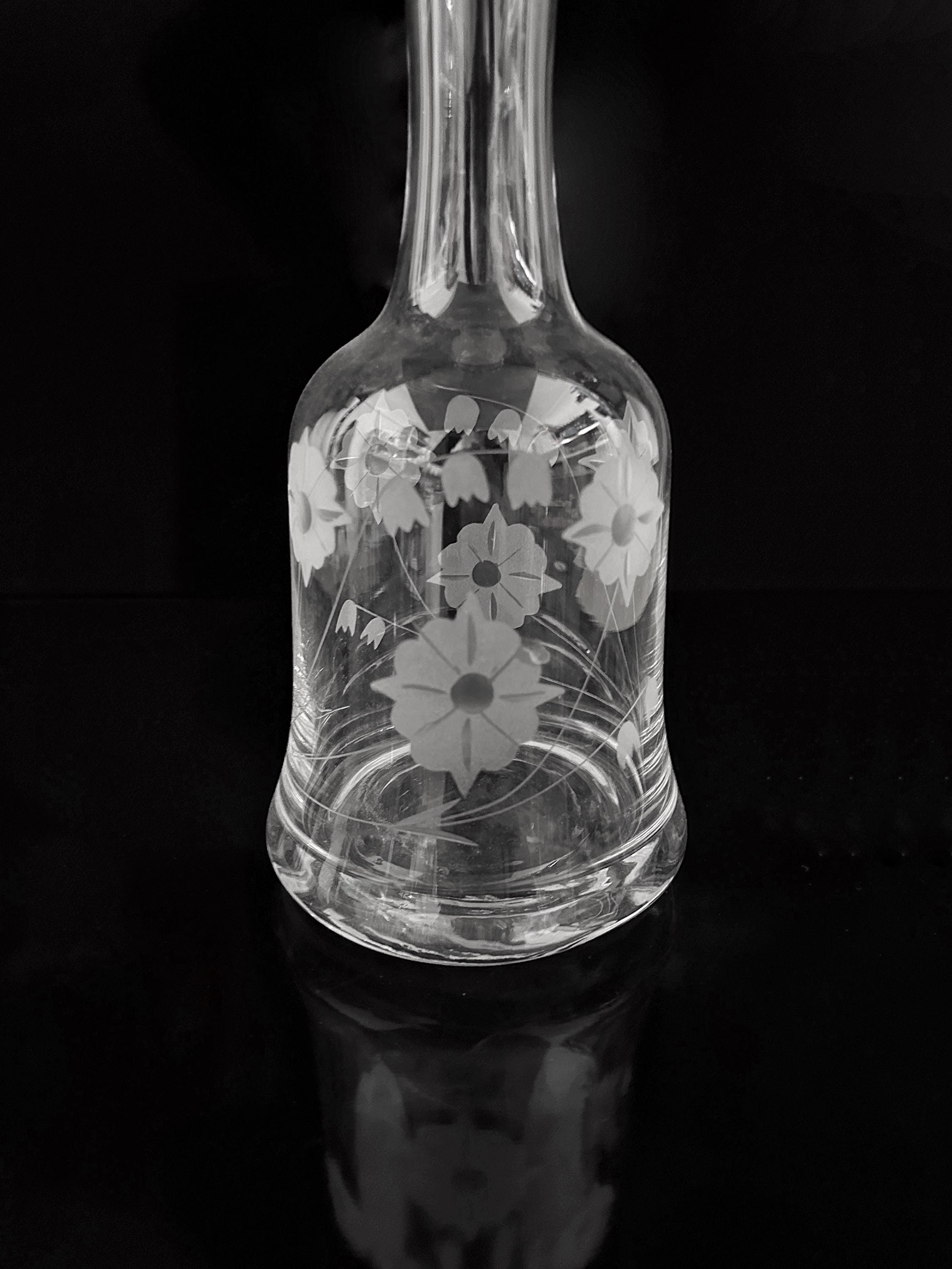 Transparent, high-quality glass with cut-in decoration: flowers and lilies of the valley. Very beautiful workmanship