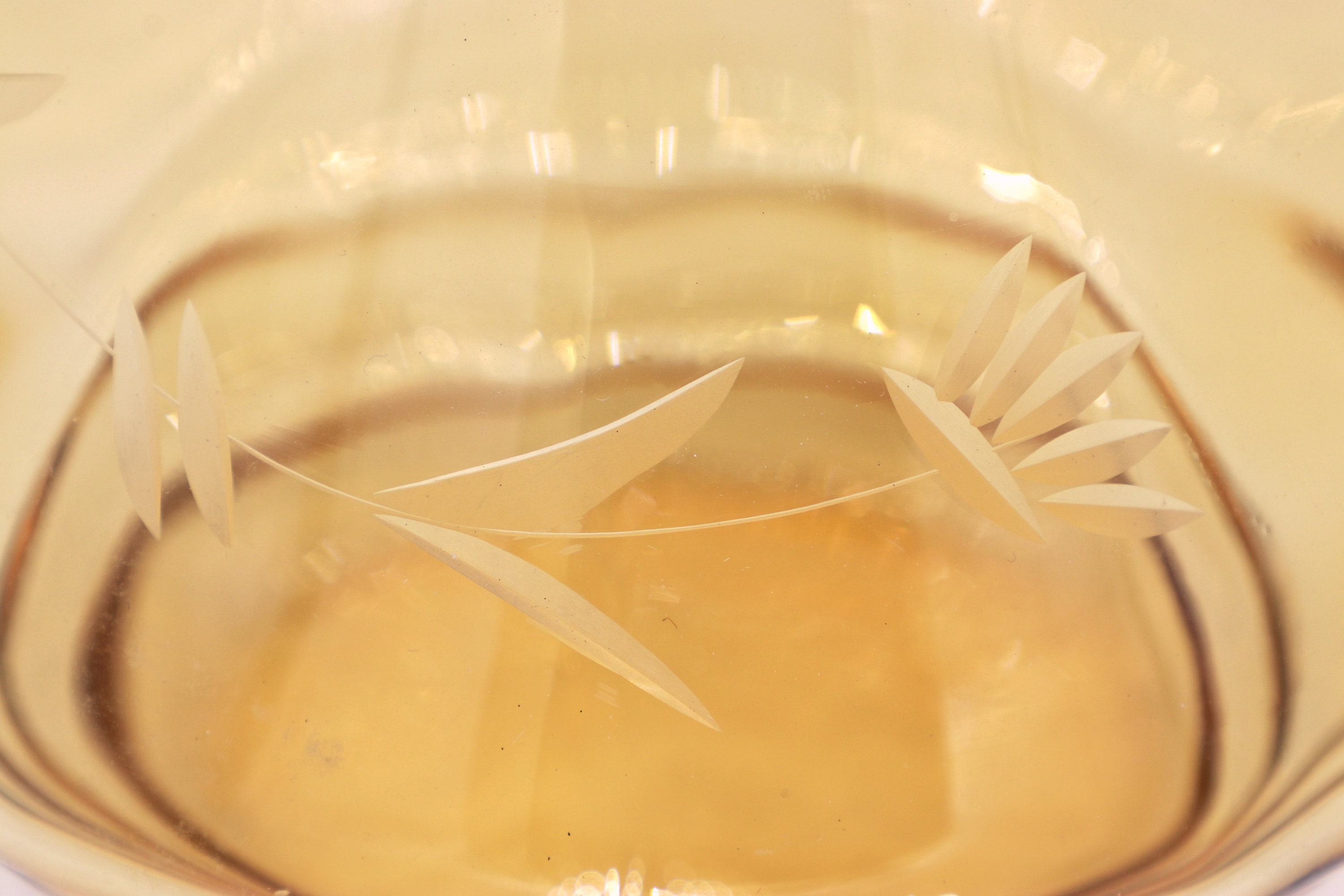 Vintage Carafe Art Deco Lead Cut Engraving Flowers Floral Modernist Glass Amber Yellow Juice Jug Pitcher 1930s 30s 20s 30s