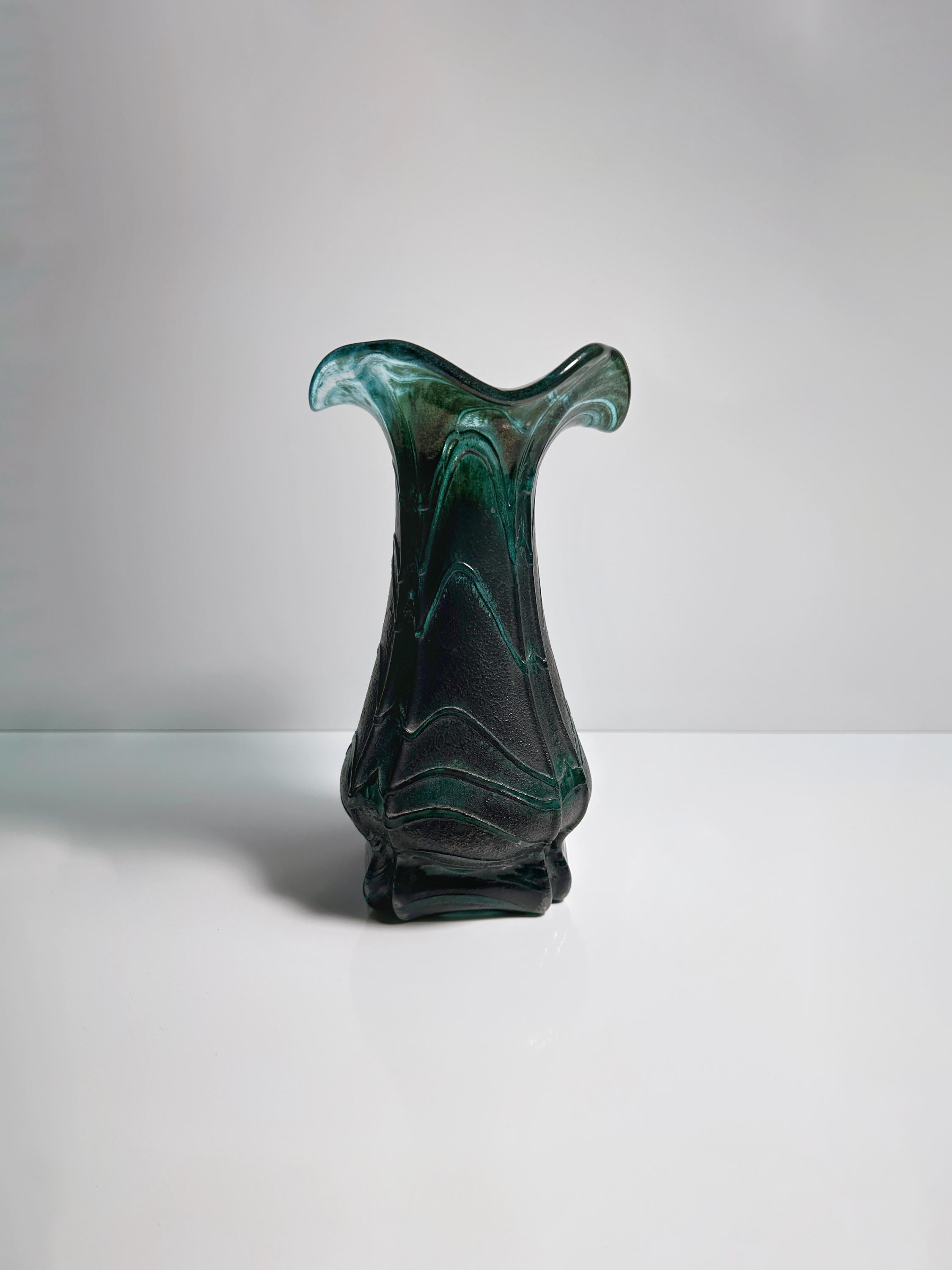 Beautiful vintage glass vase in Art Nouveau look: dark green glass with a typical organic design. Made by the Weinfurtner Glashütten in Germany in the late 1980s based on a model from around 1910.