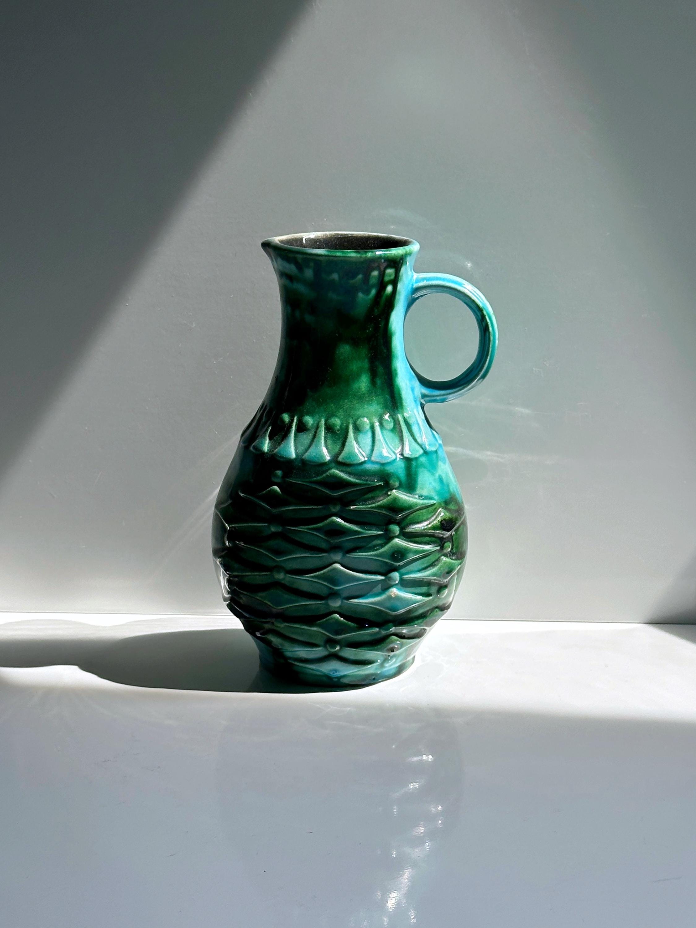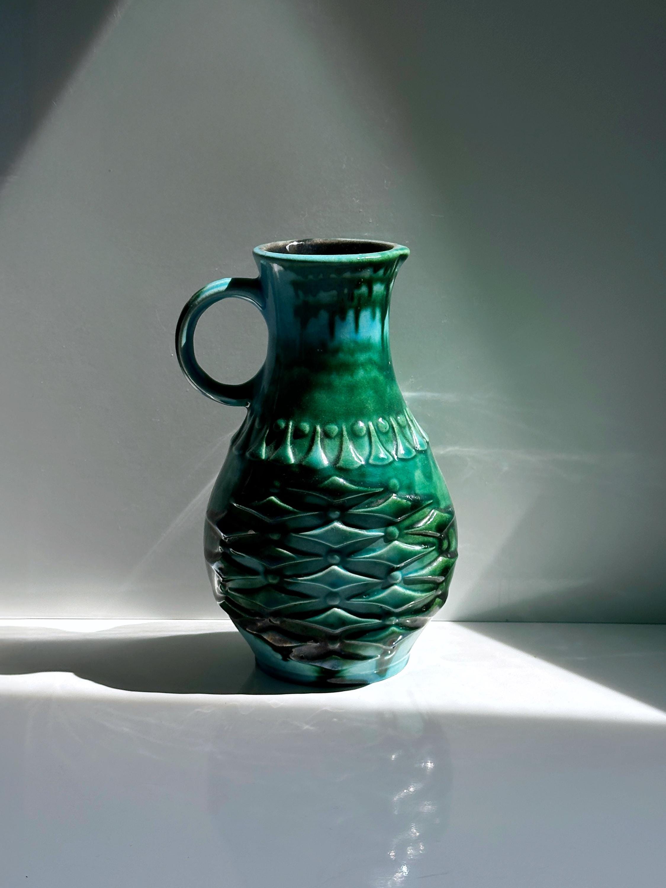 Vintage Ceramic Vase Übelacker "1651 20" 70s Fat Lava Green Turquoise Handle Vase Mid Century Glaze Scheurich Bay MF Karlsruhe Modernist