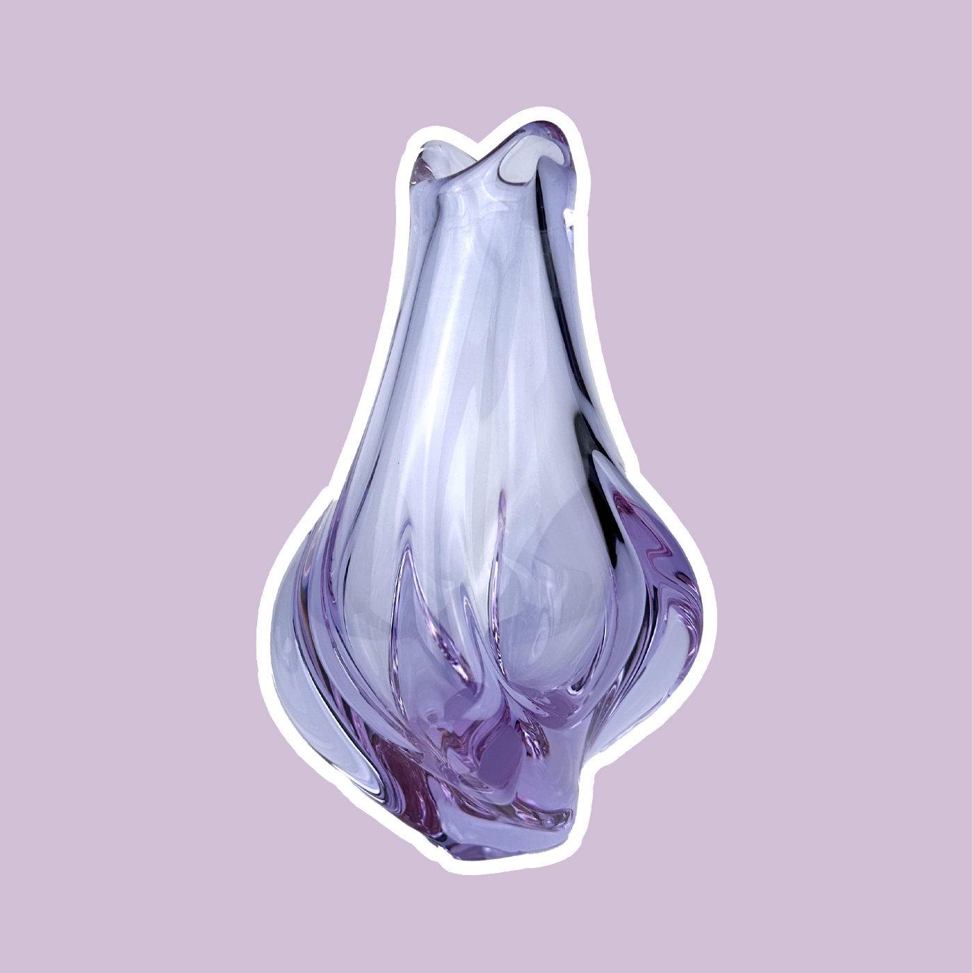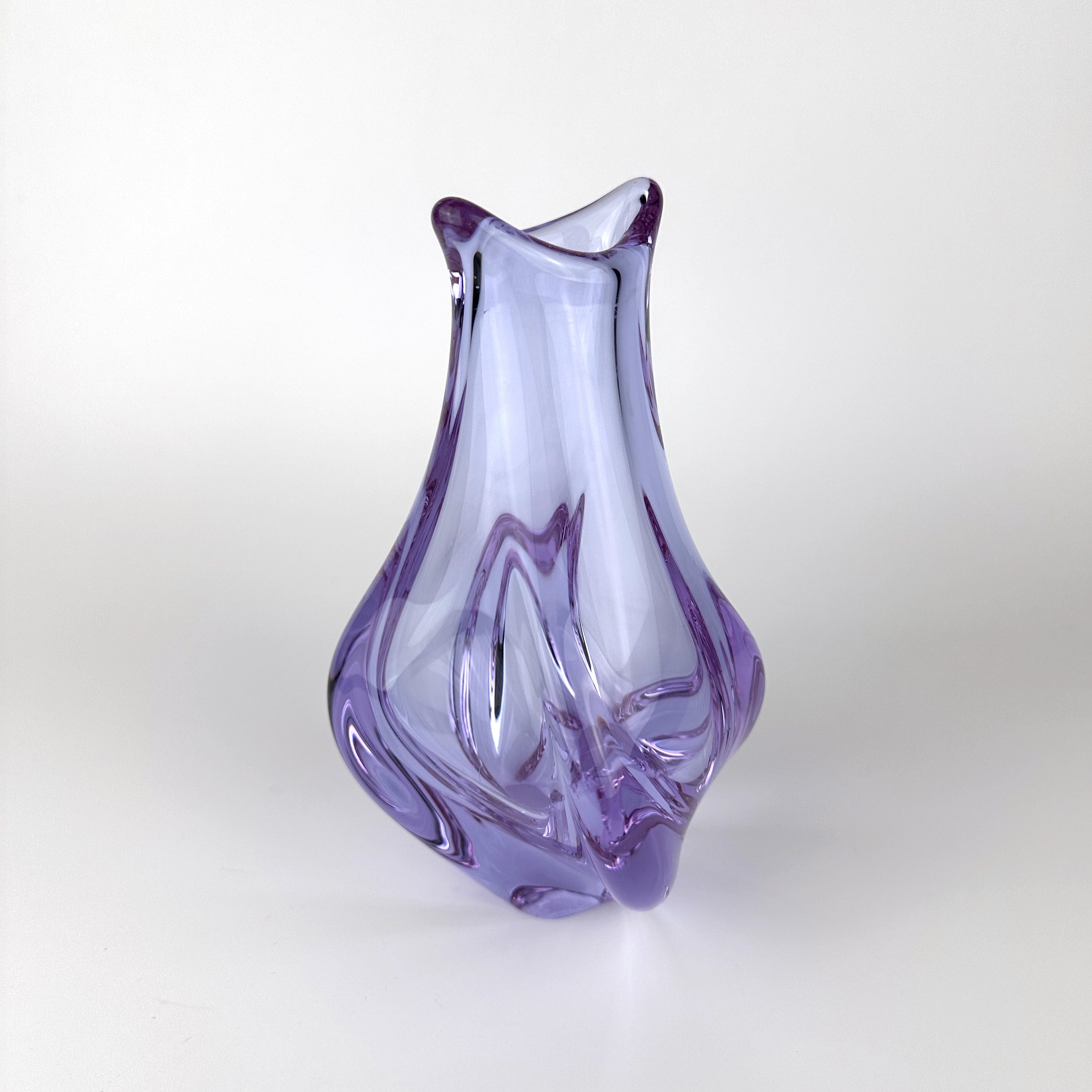 Beautiful vase made of alexandrite glass. This type of glass changes color depending on the light temperature. In daylight and generally warm light, the glass appears pink to violet. In cold light such as fluorescent tubes, the glass appears light blue to lilac.