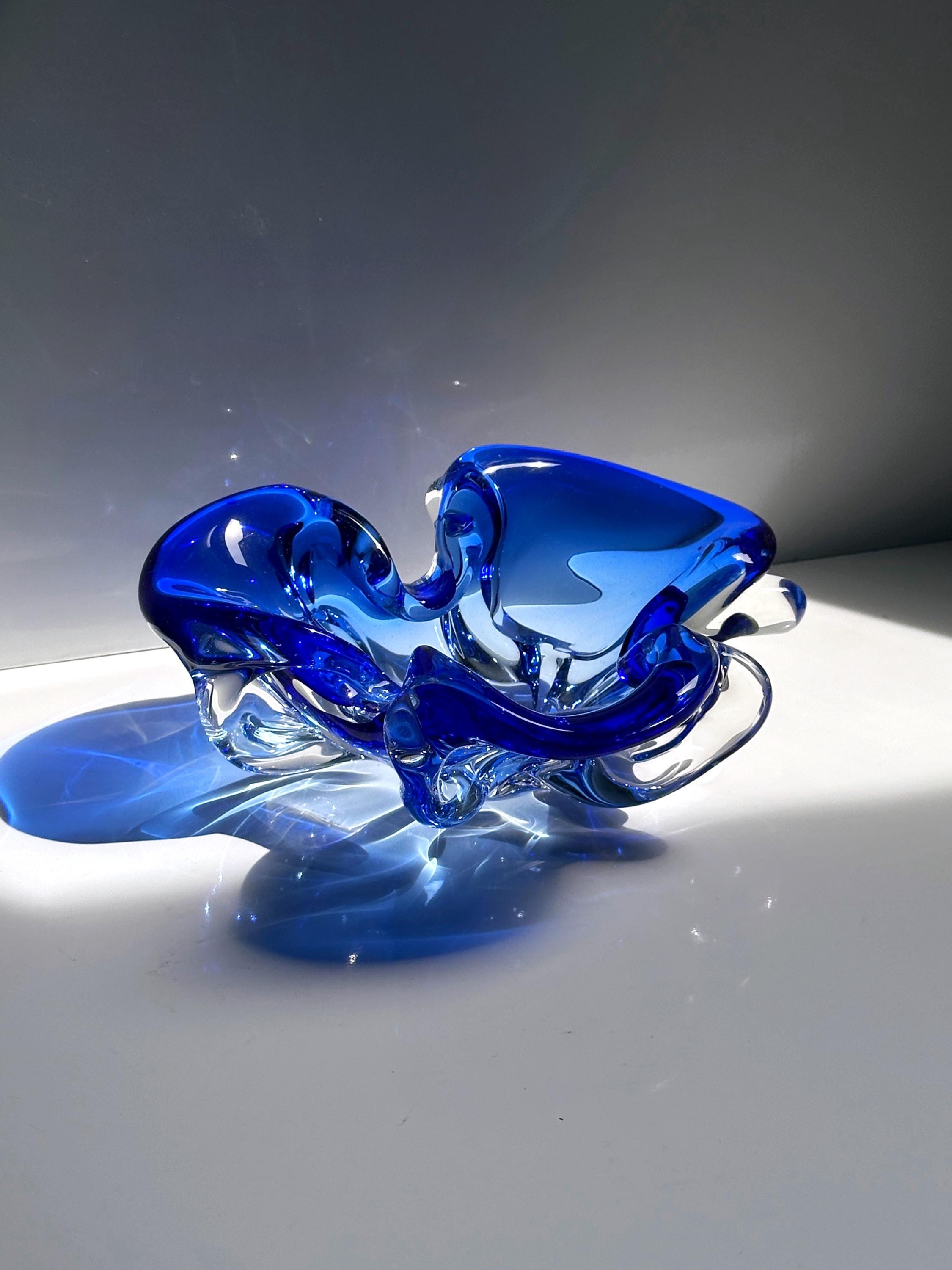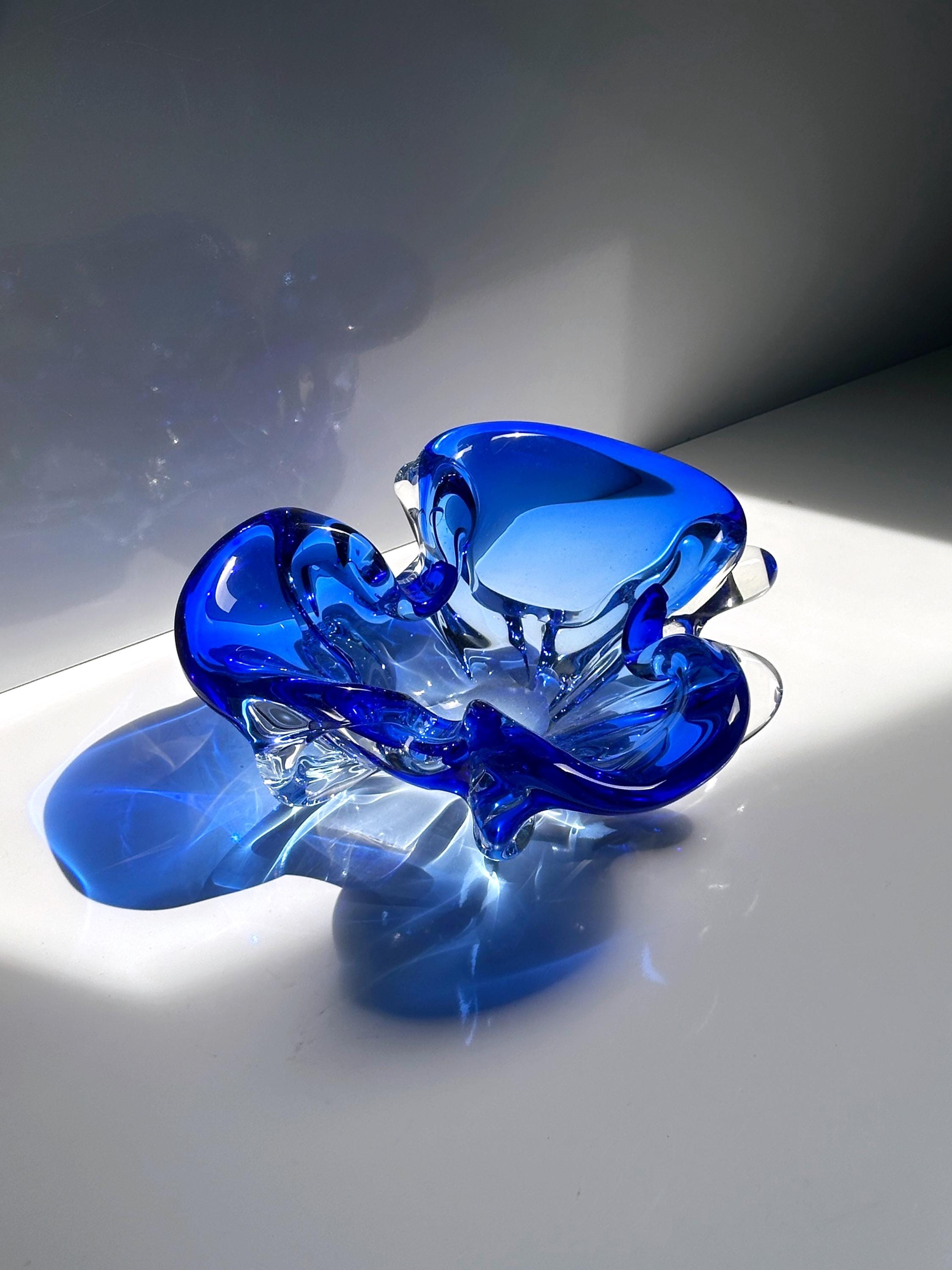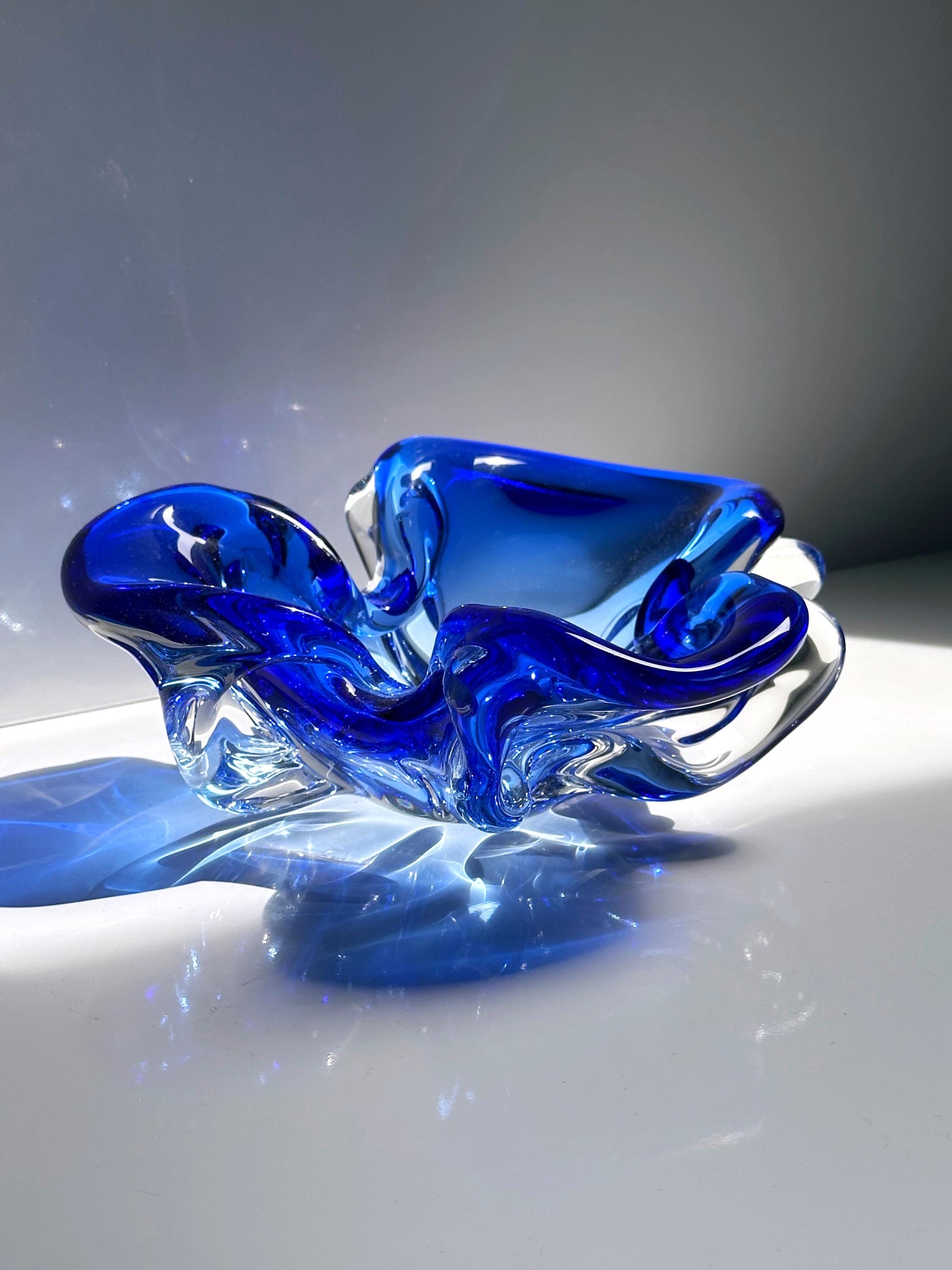 Vintage Bohemian Ashtray Bowl CZ Glass Blue Flower 60s 70s Seguso Cobalt Ultramarine Blue 70s 1970
