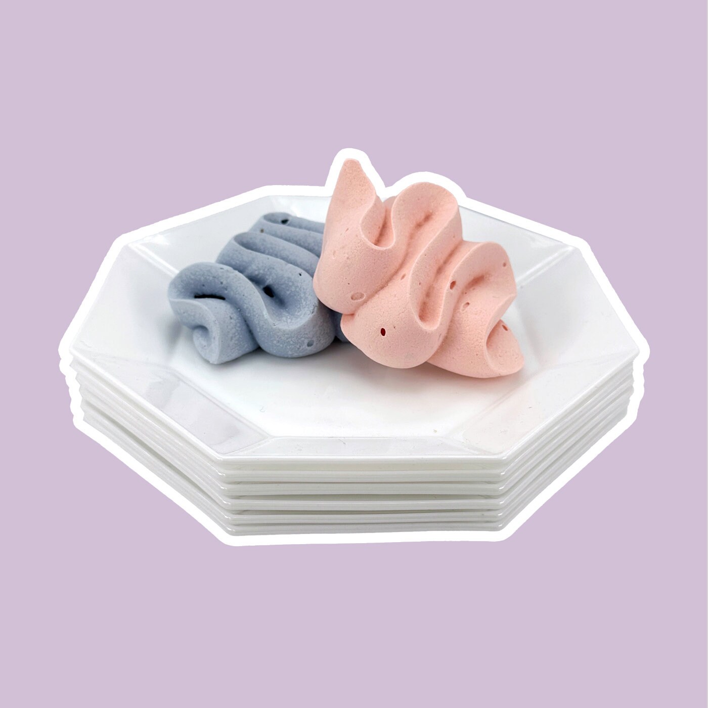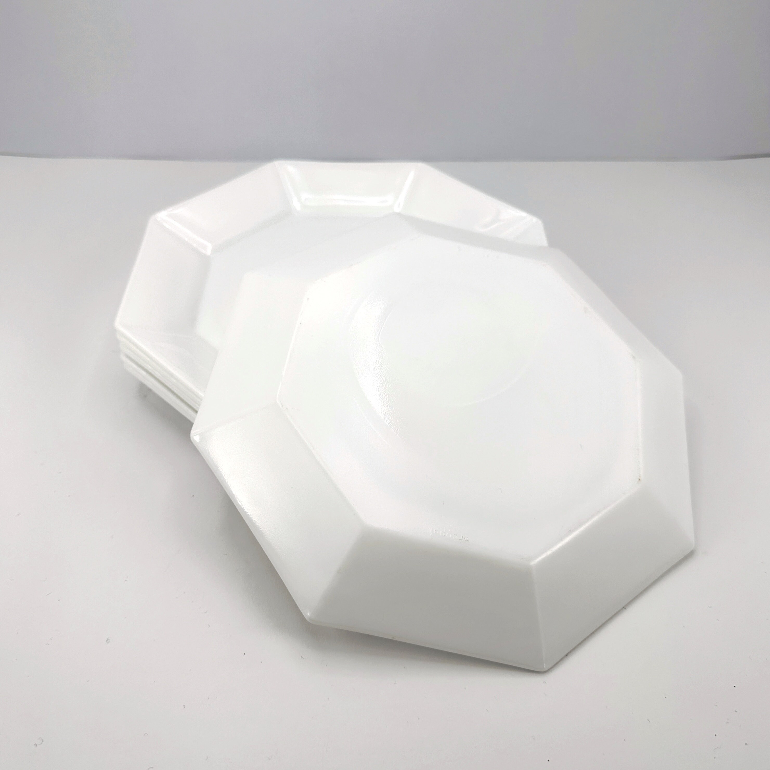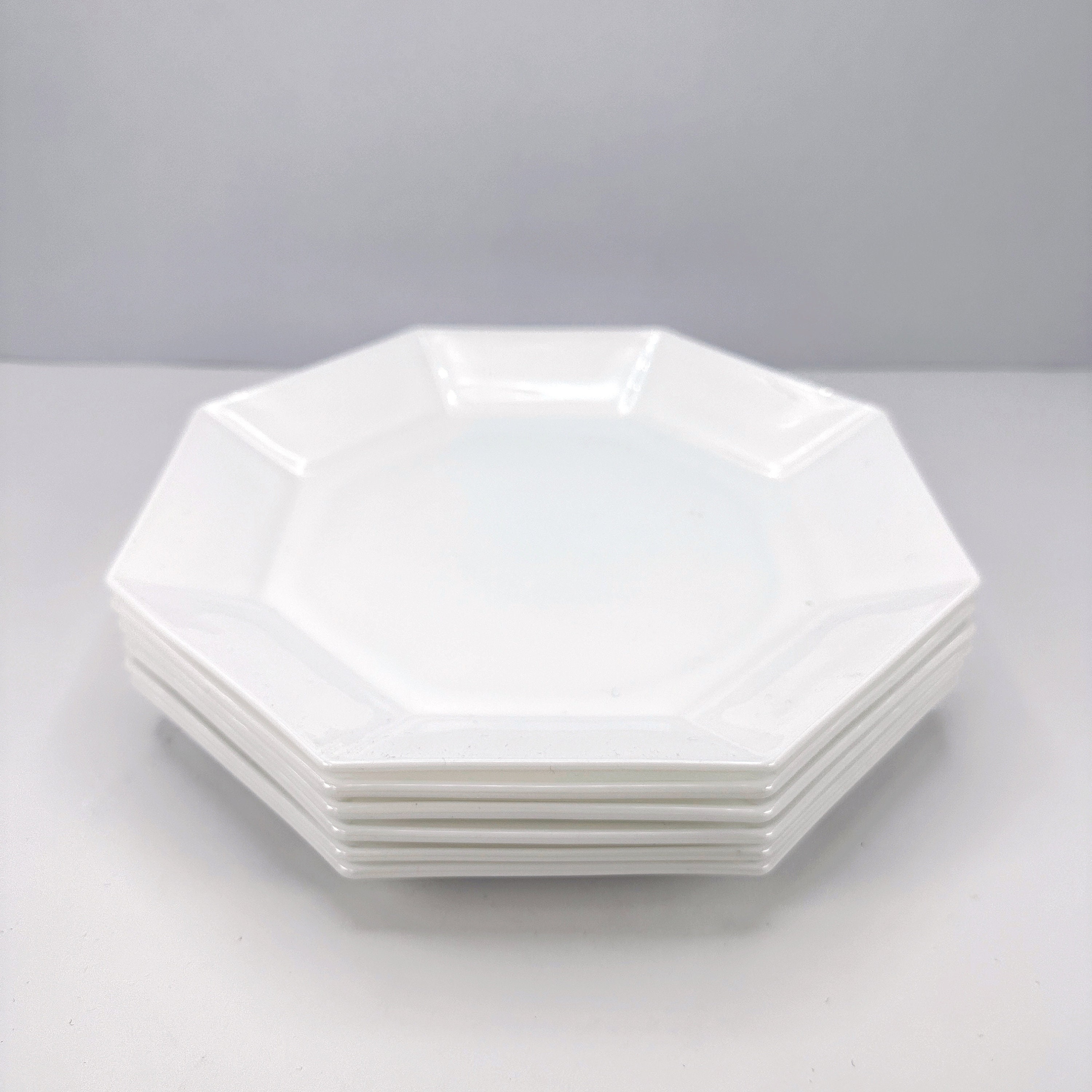 6 beautiful white dinner plates from the late 1980s on Arcoroc France from the world-famous Octime series. Here in the rare white option made of Arcopal / frosted glass. Octagonal design in Art Deco Revival style.