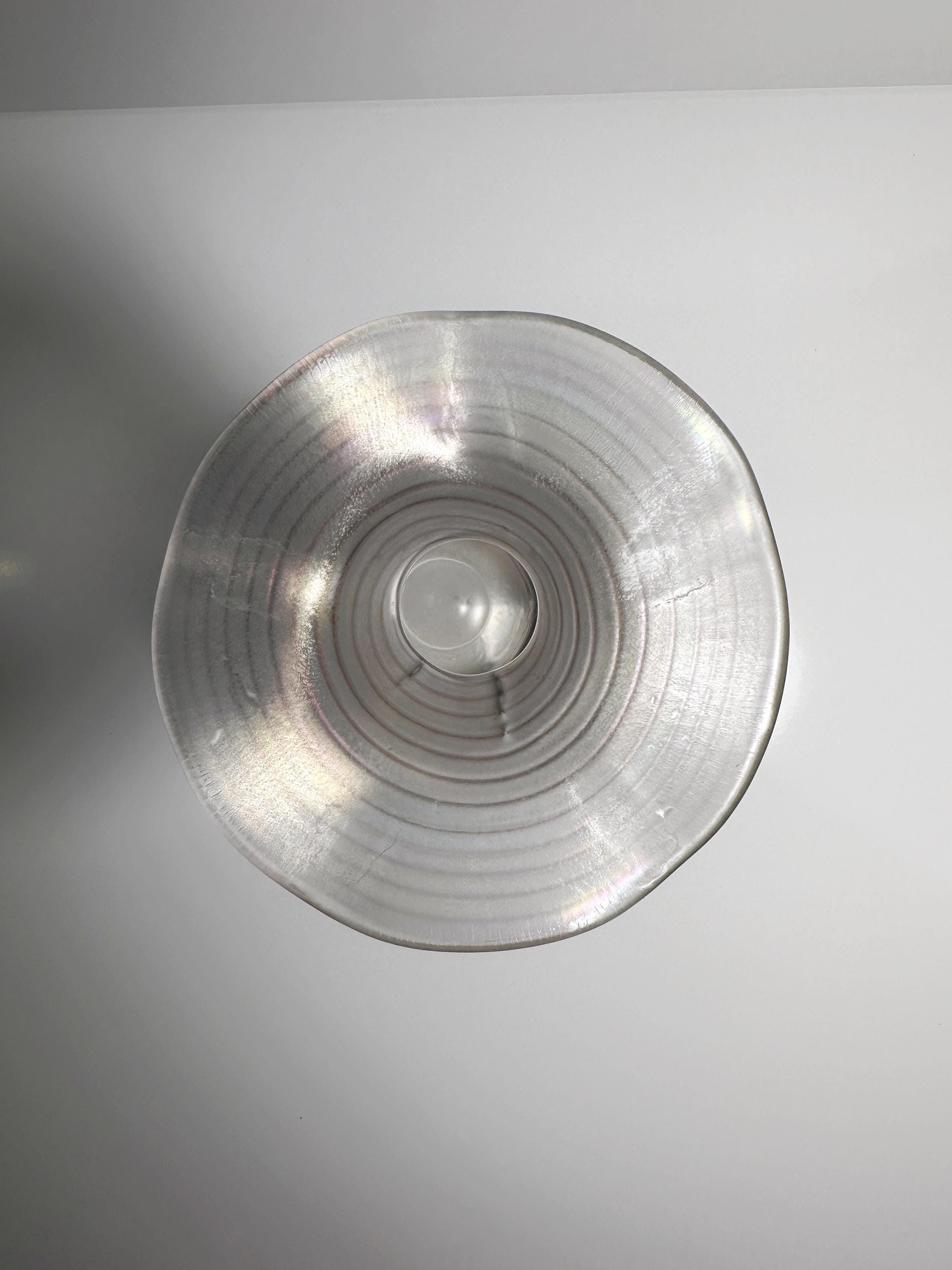 Very beautiful iridescent Art Nouveau glass vase by Gallo. Wavy edges, light swirl stripes and a beautiful rainbow-like shine characterize this vase.
