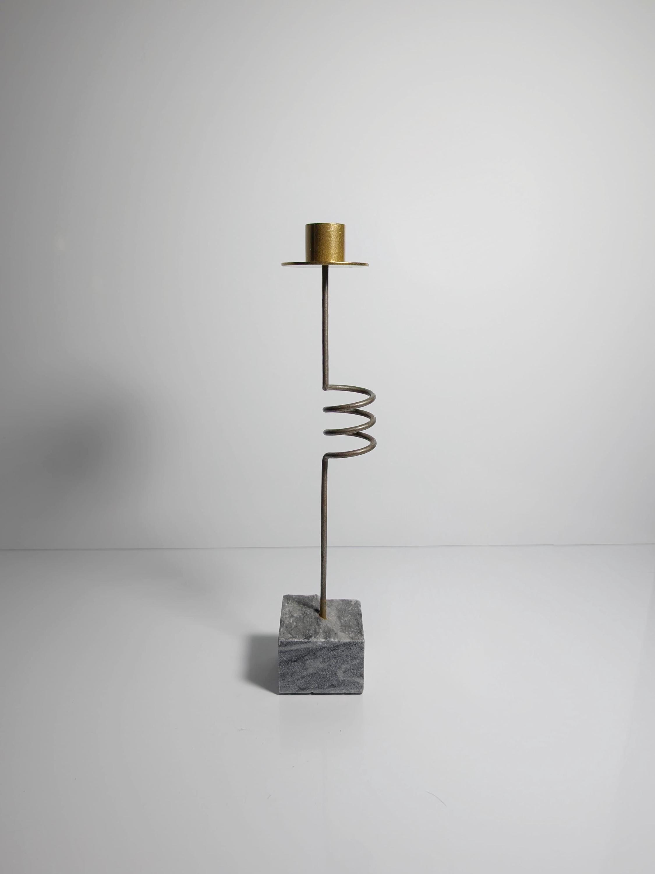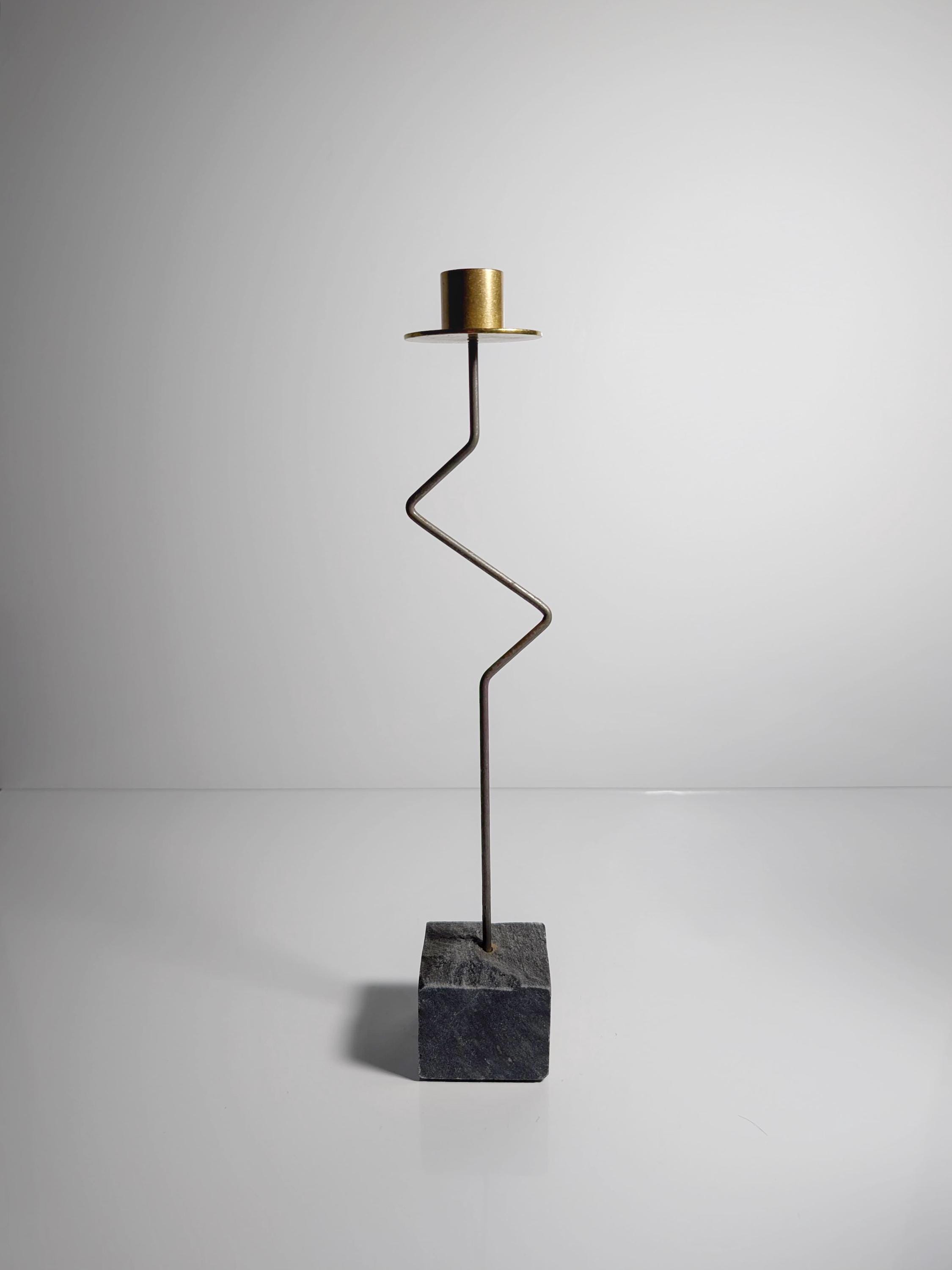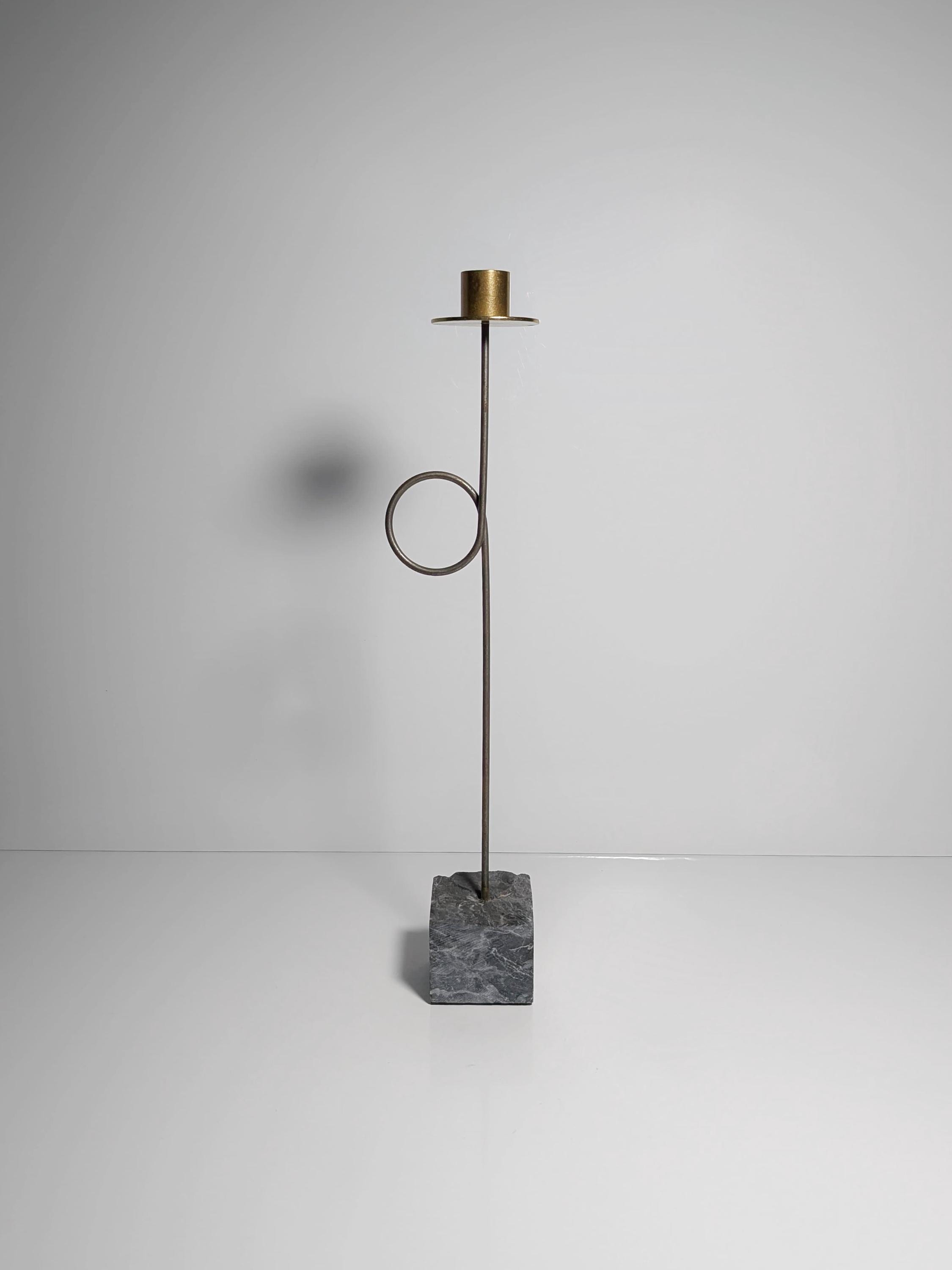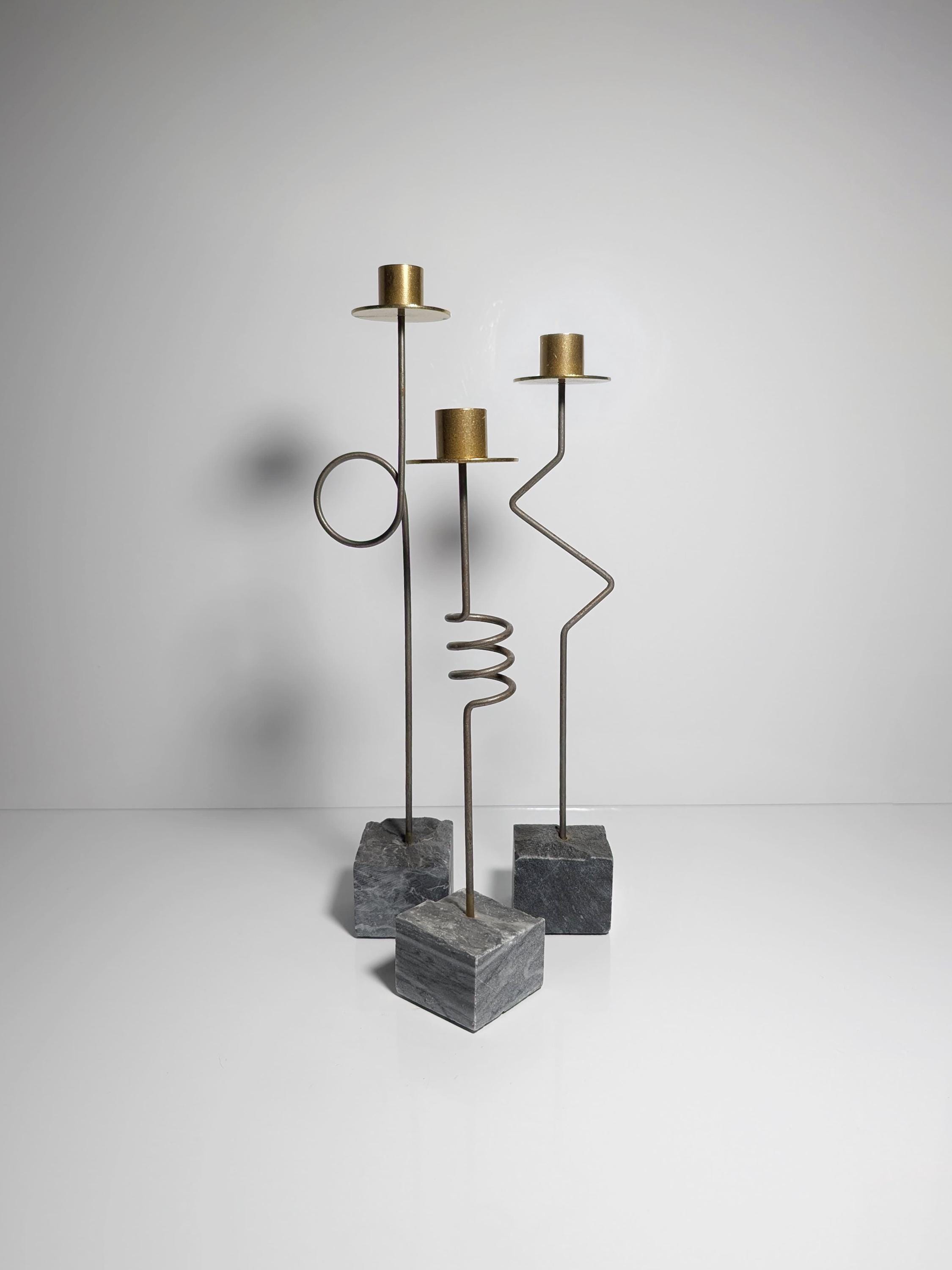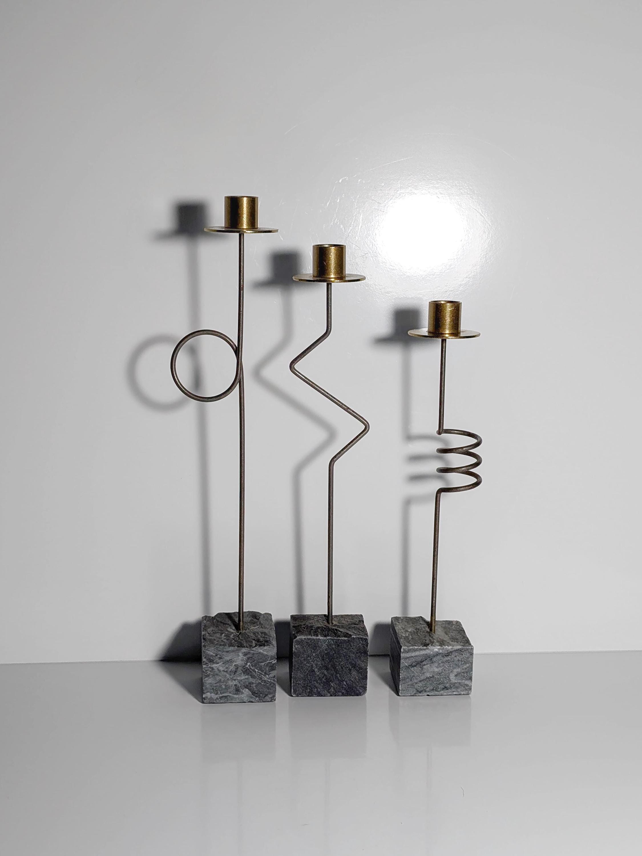 Very nice candle holder set from the late 1980s in postmodern style. Vintage Ikea "KRÄSEN" designed by Ehlén Johansson 1987. Brass meets stone base.