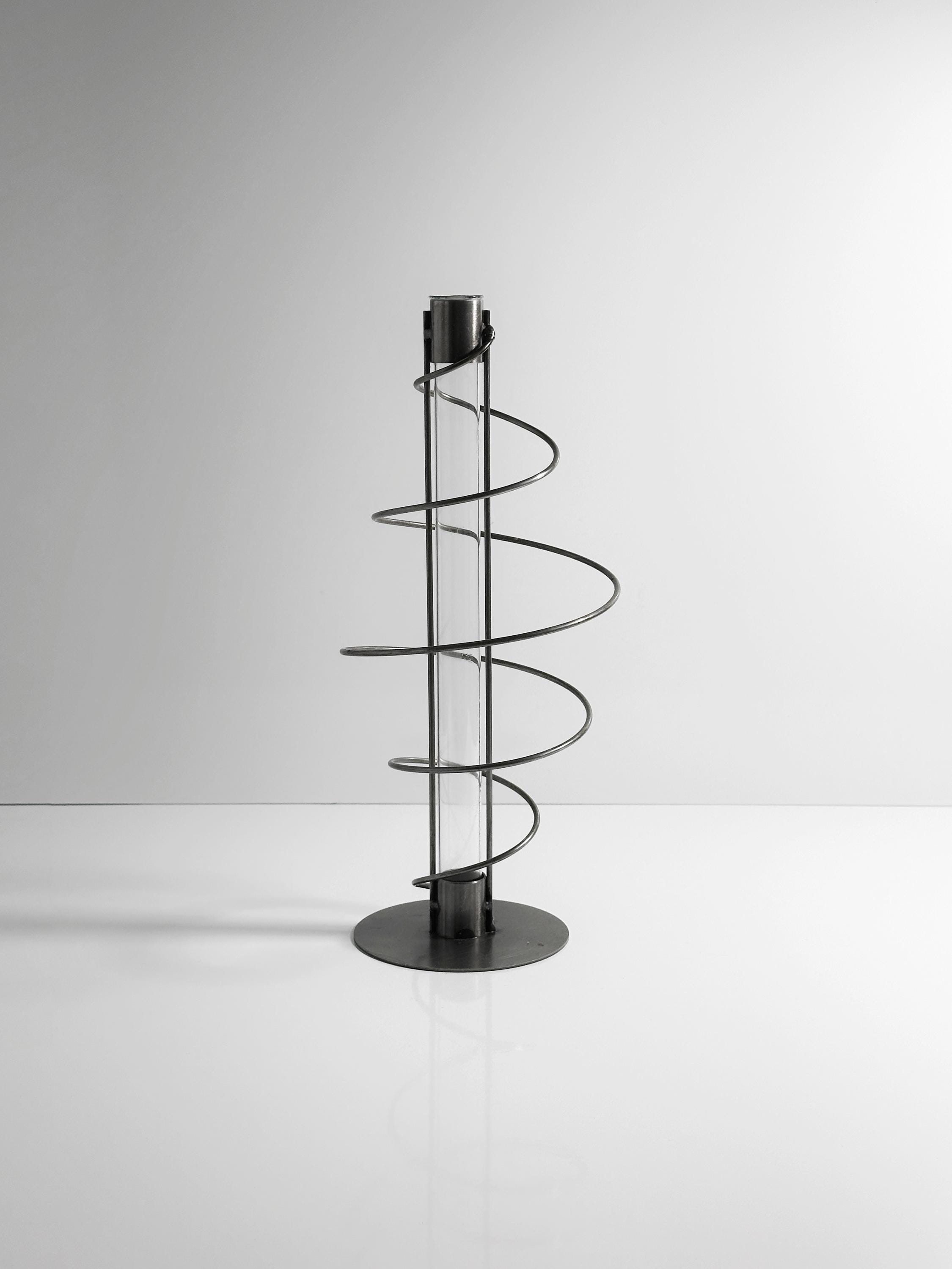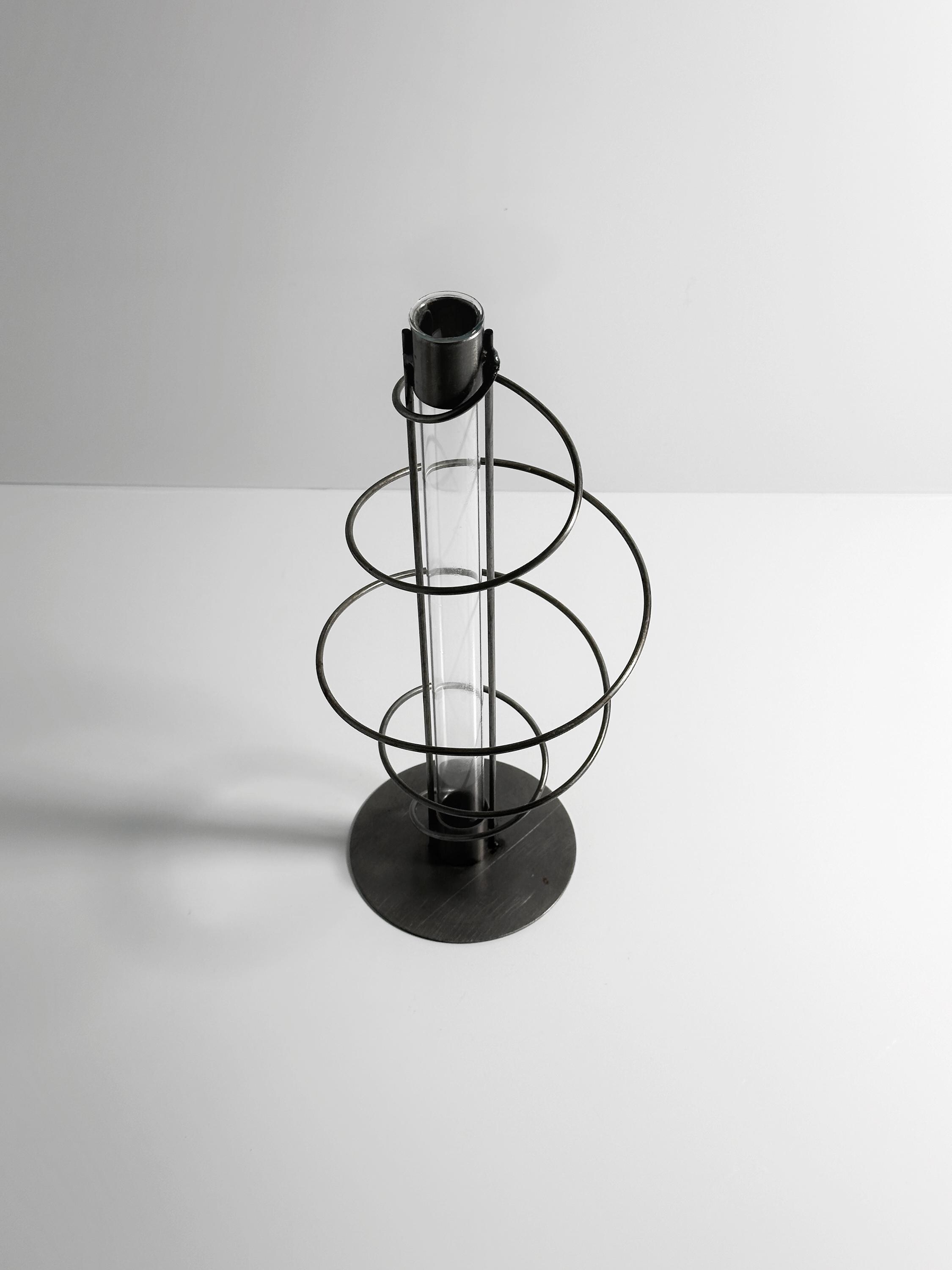 A very beautiful postmodern vase from the 1990s in the postmodern style. The vase consists of a glass cylinder held in a metal frame. The frame spirals around the glass vase in the center of the object.
