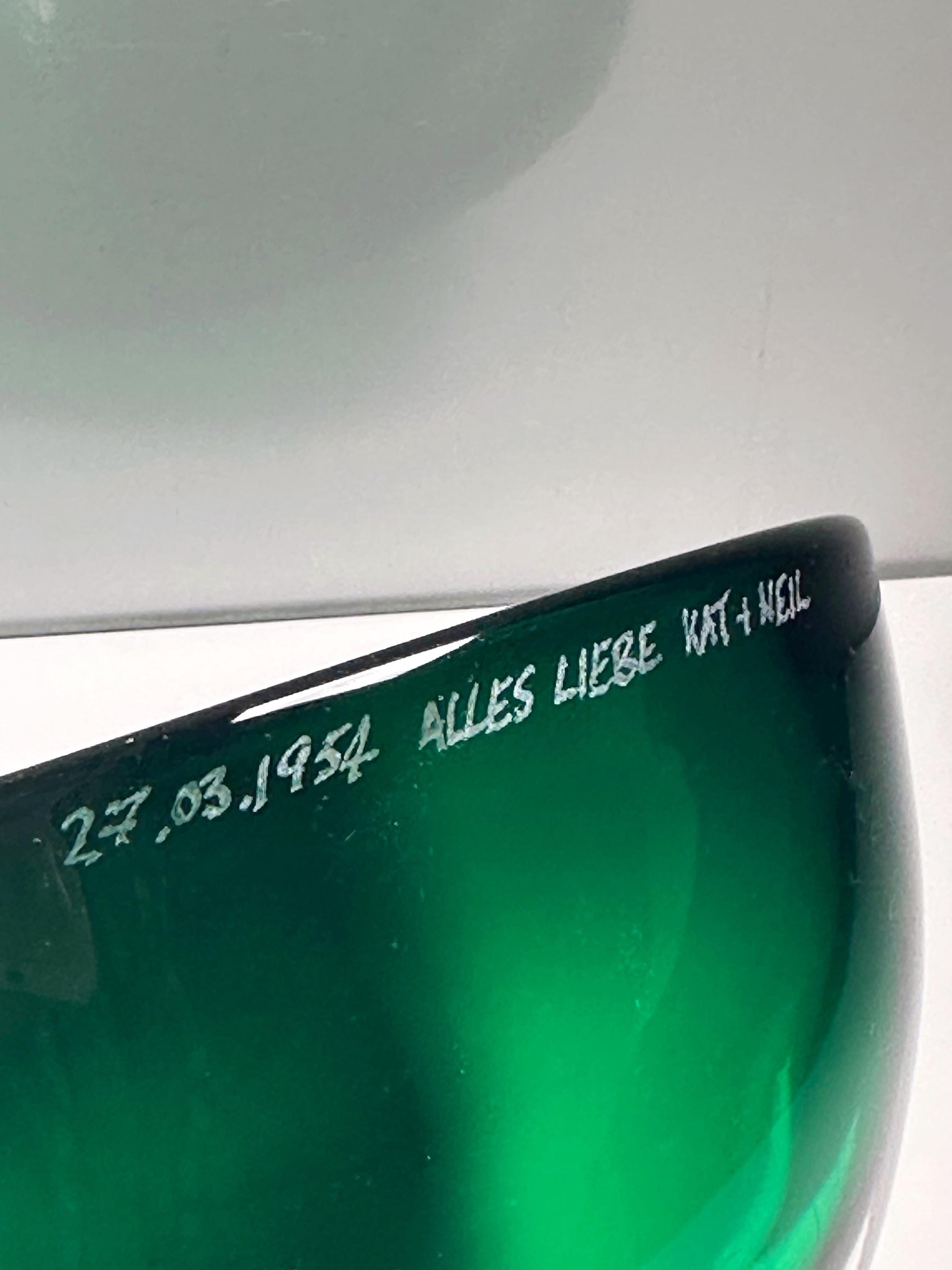 Very beautiful glass bowl by Glasstorm Scotland, handmade and engraved in German: "27.03.1954 All the best Kat & Neil"