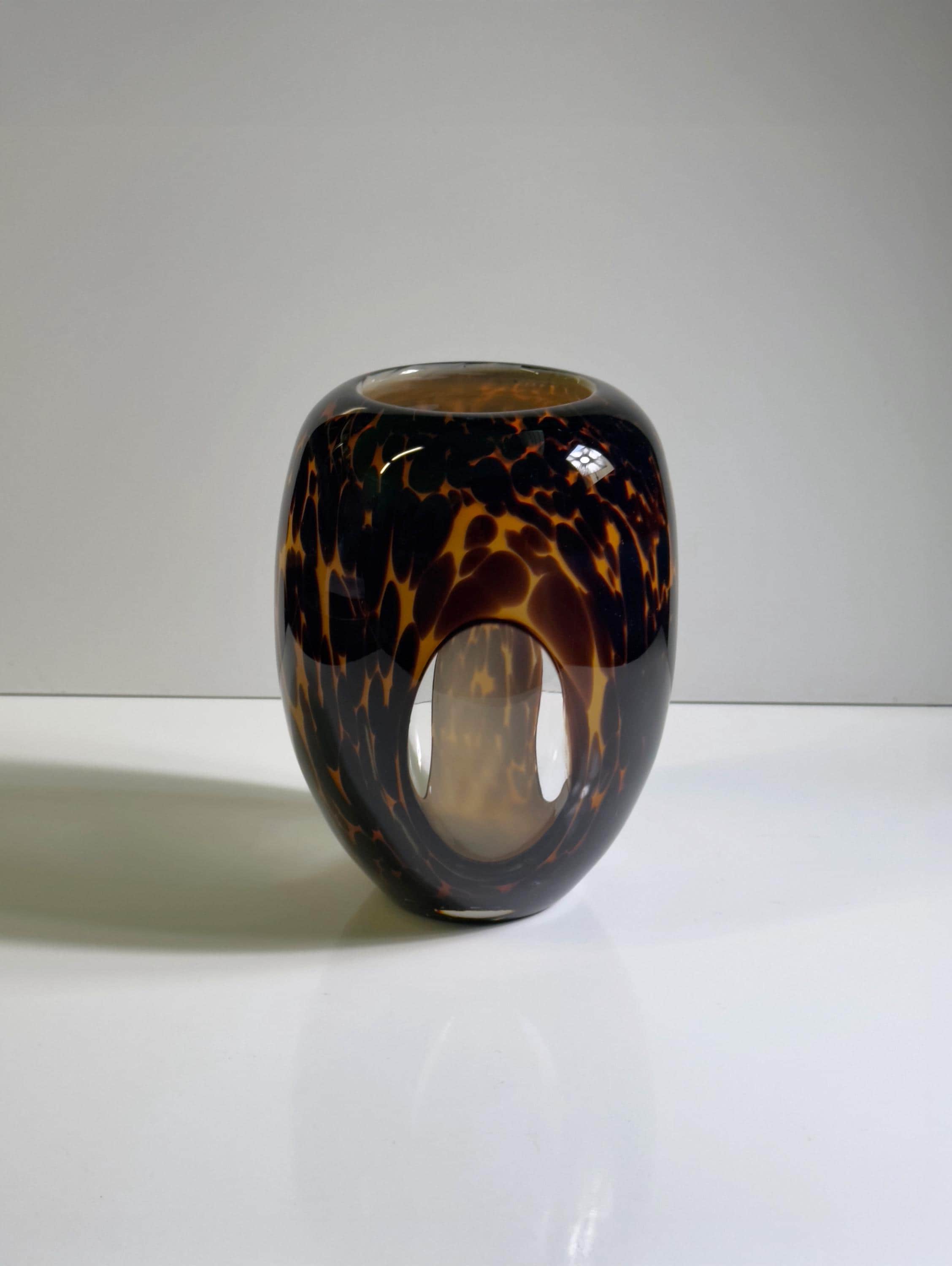 A beautiful vintage vase in tortoise-effect glass: several layers of colored glass create a striking pattern. A unique feature is the inclusion of transparent glass, allowing you to see inside the vase. A truly lovely piece of craftsmanship from the 1980s.