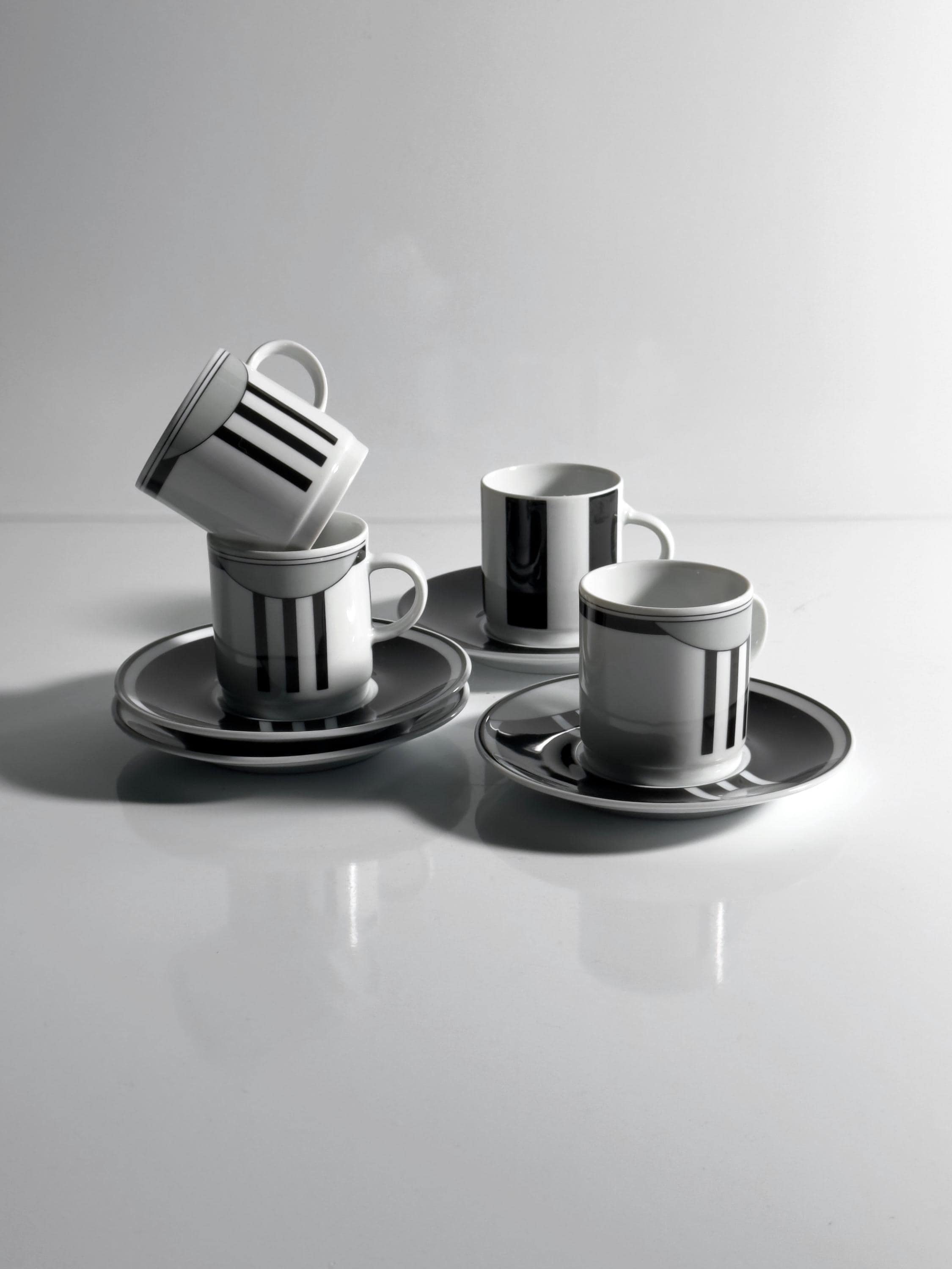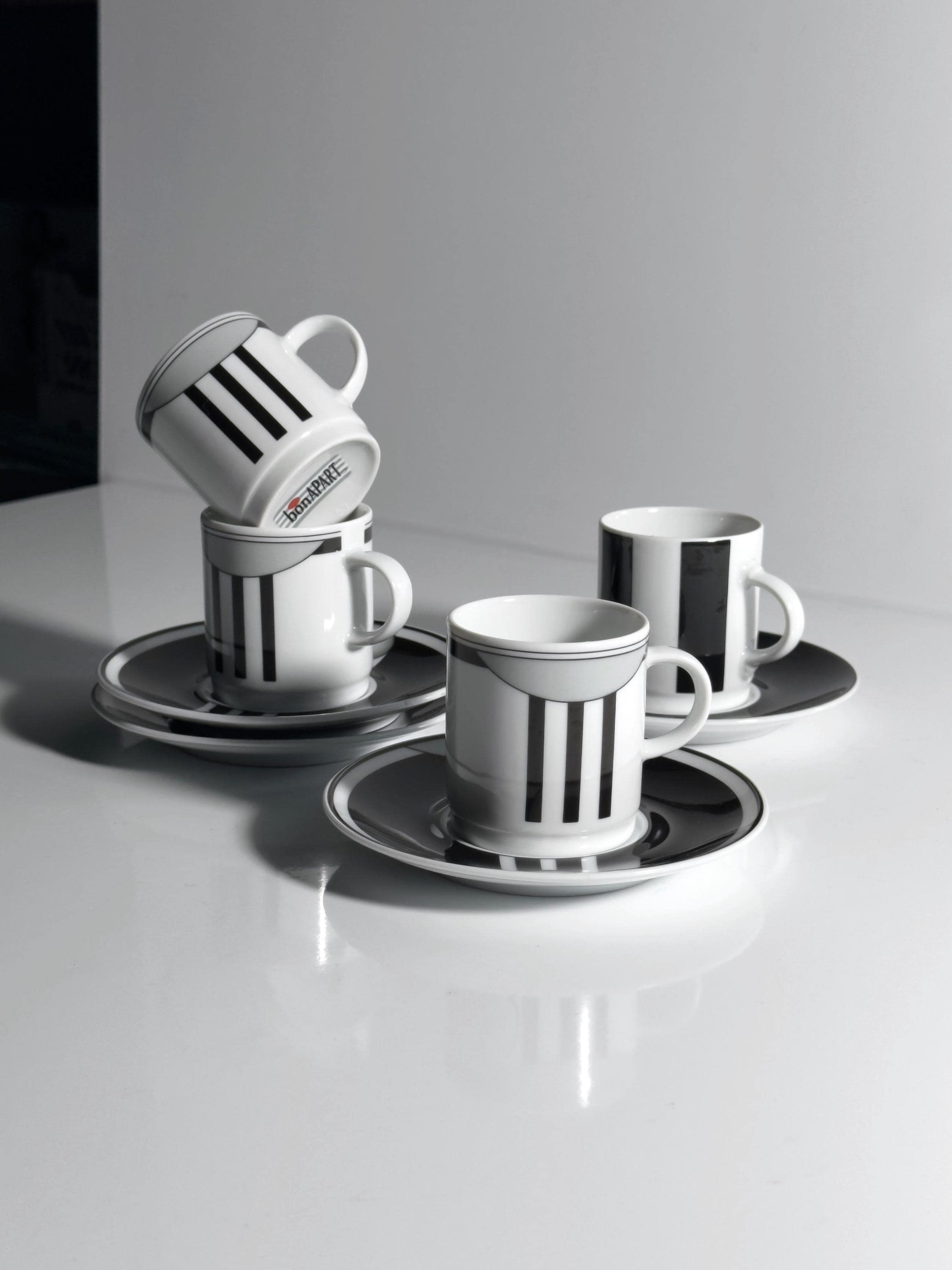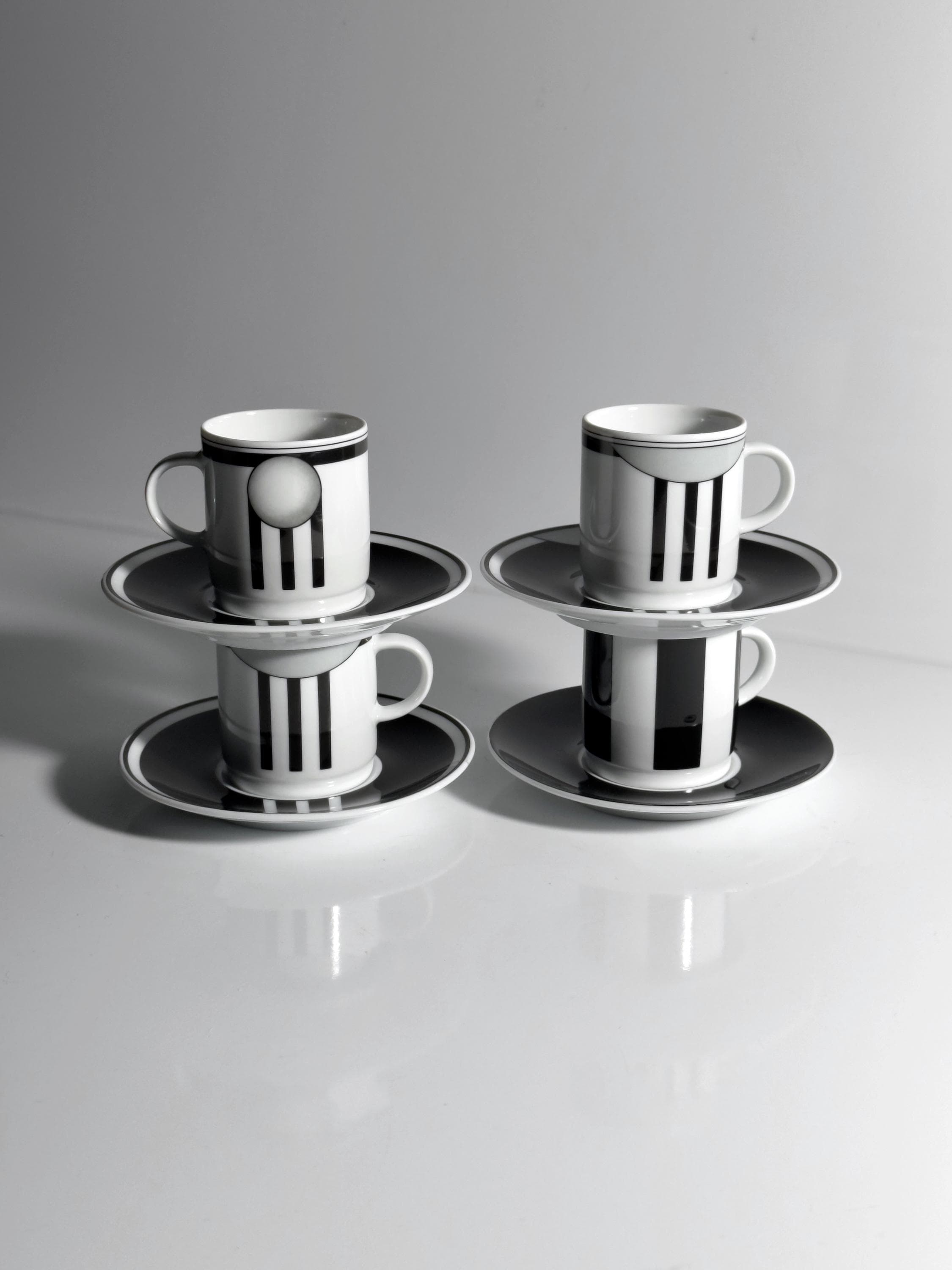 It consists of four espresso cups with matching saucers. Graphic design in the typical Art Deco Revival style of the late 1980s.