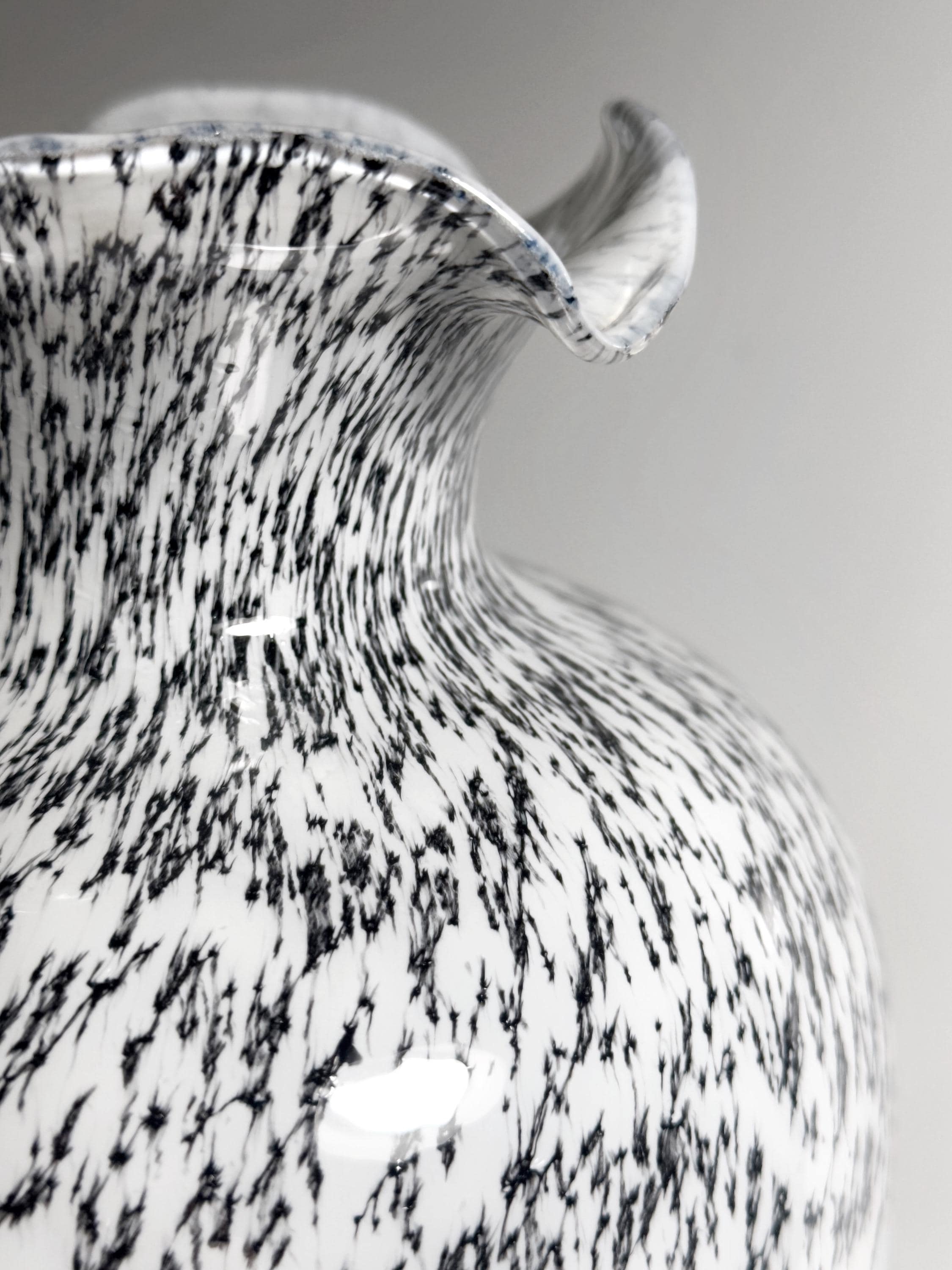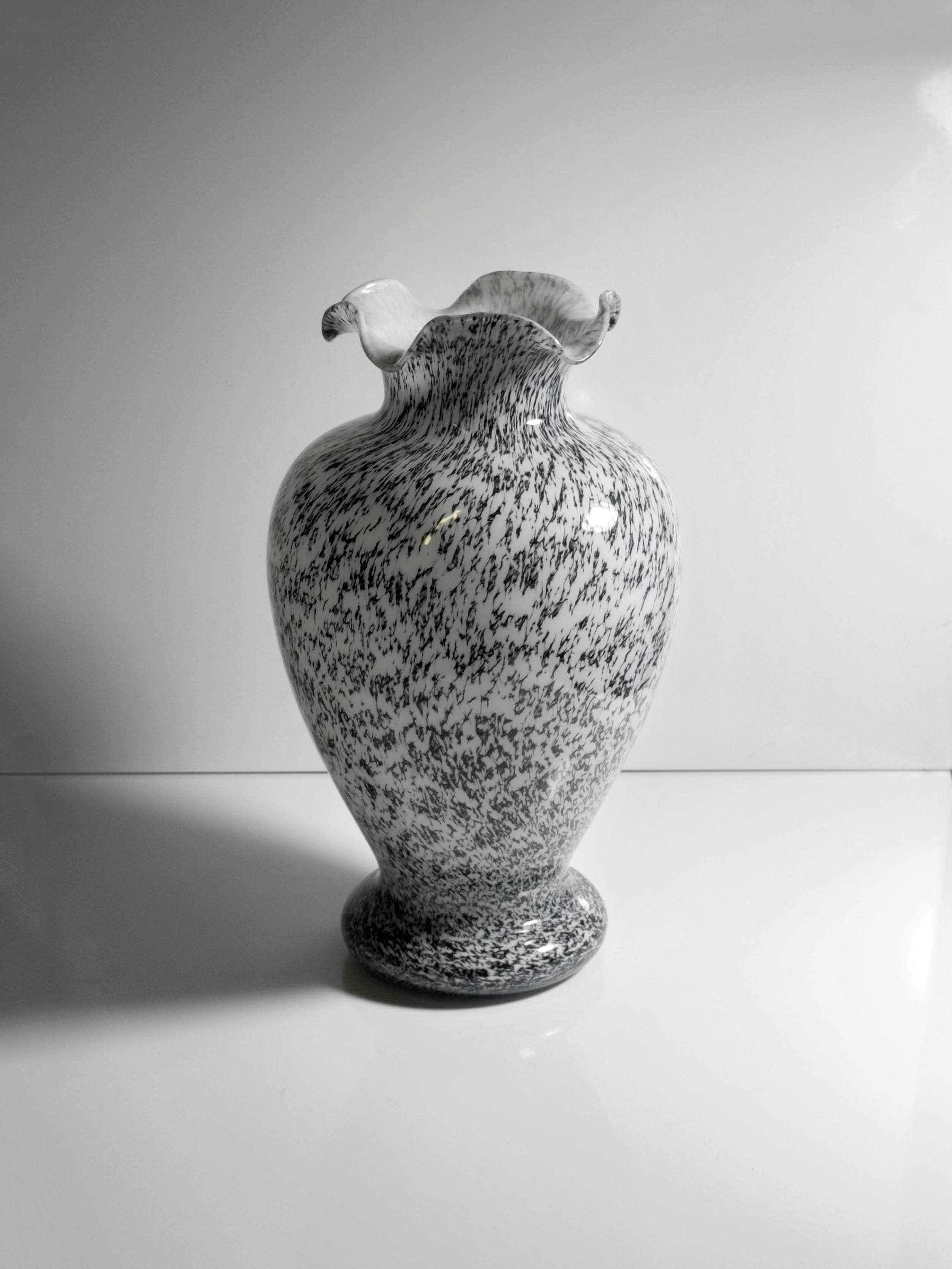 A beautiful Italian glass vase from Murano, dating from the 1980s. Multi-layered, mouth-blown glass in the tortoise/tartaruga style, featuring white with black/grey flecks. A collector's item!