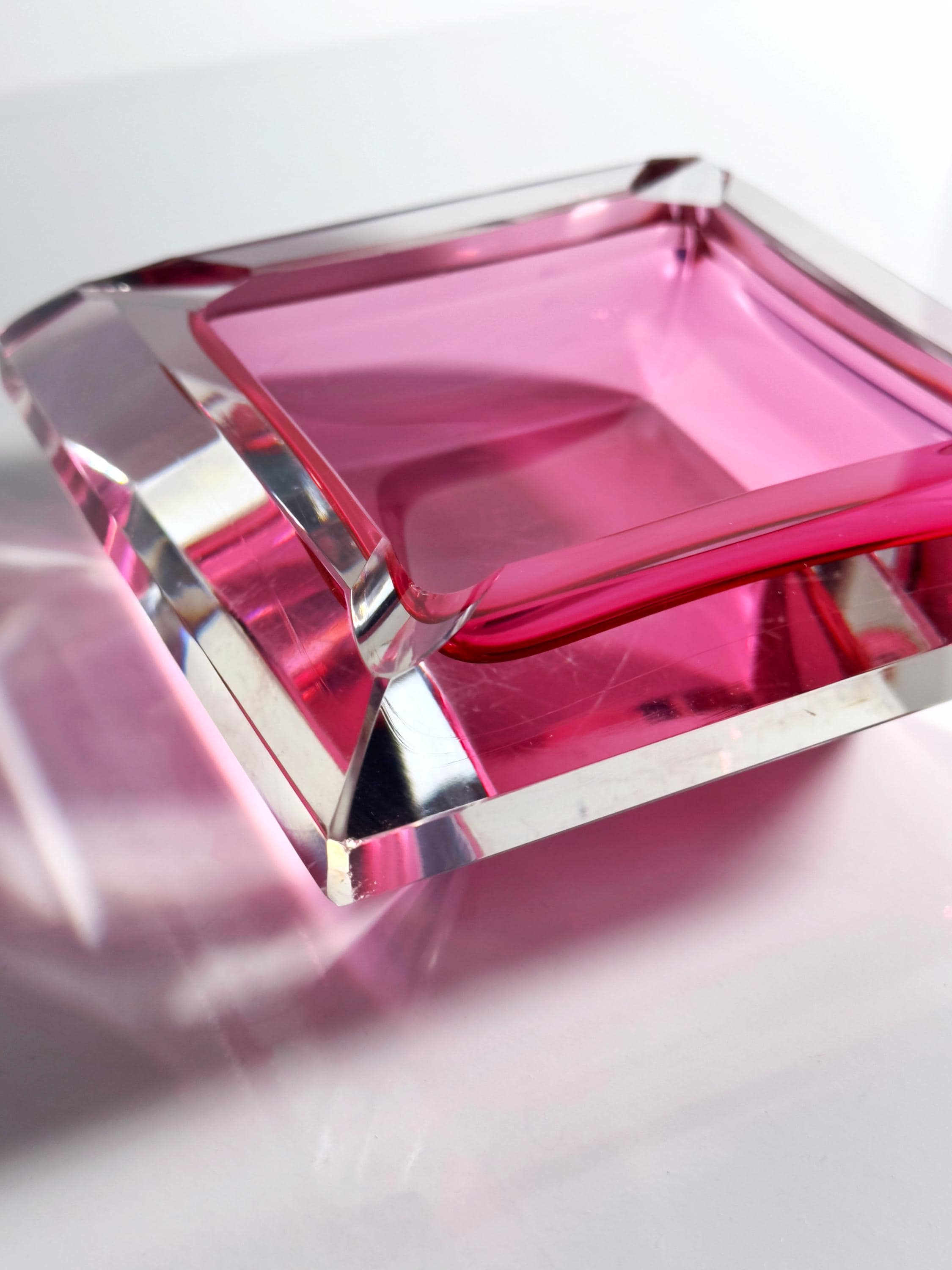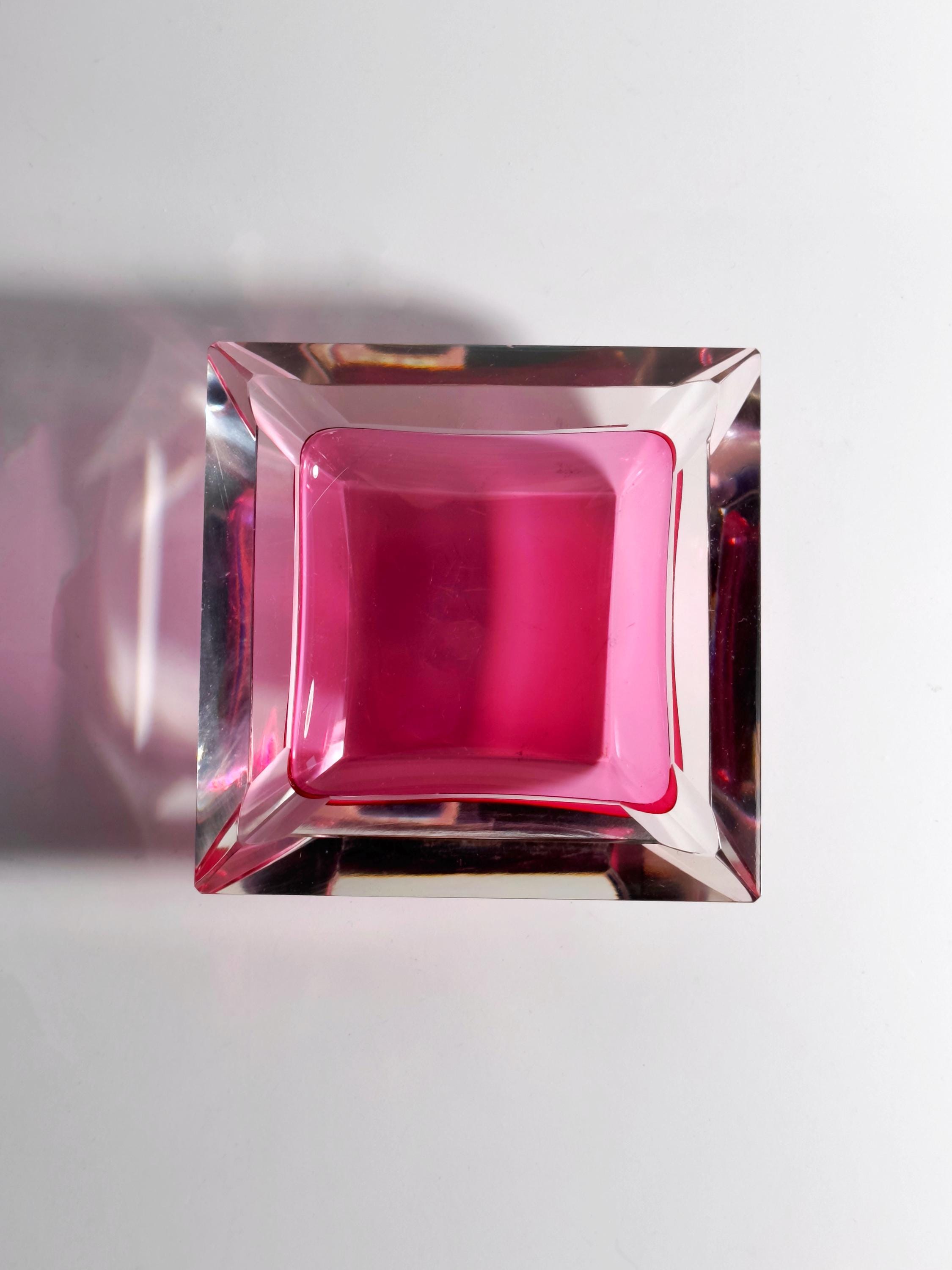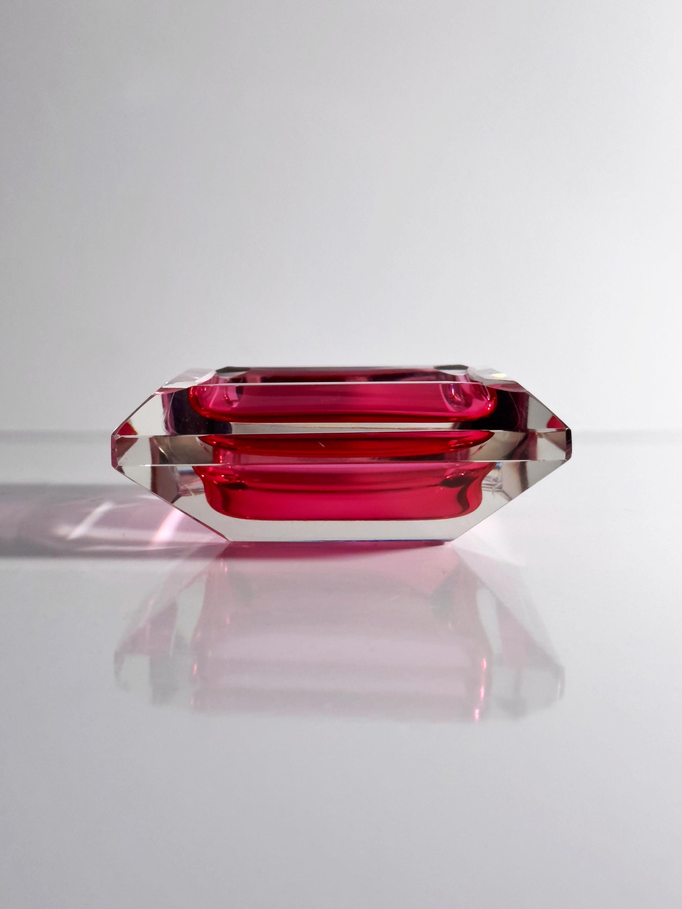 A stunningly beautiful crystal glass ashtray from Murano dating from the 1980s. Cranberry red and clear glass were fused together at high temperatures, then pressed into shape and subsequently cut. The presence of the red glass on the inside creates a striking visual effect.
