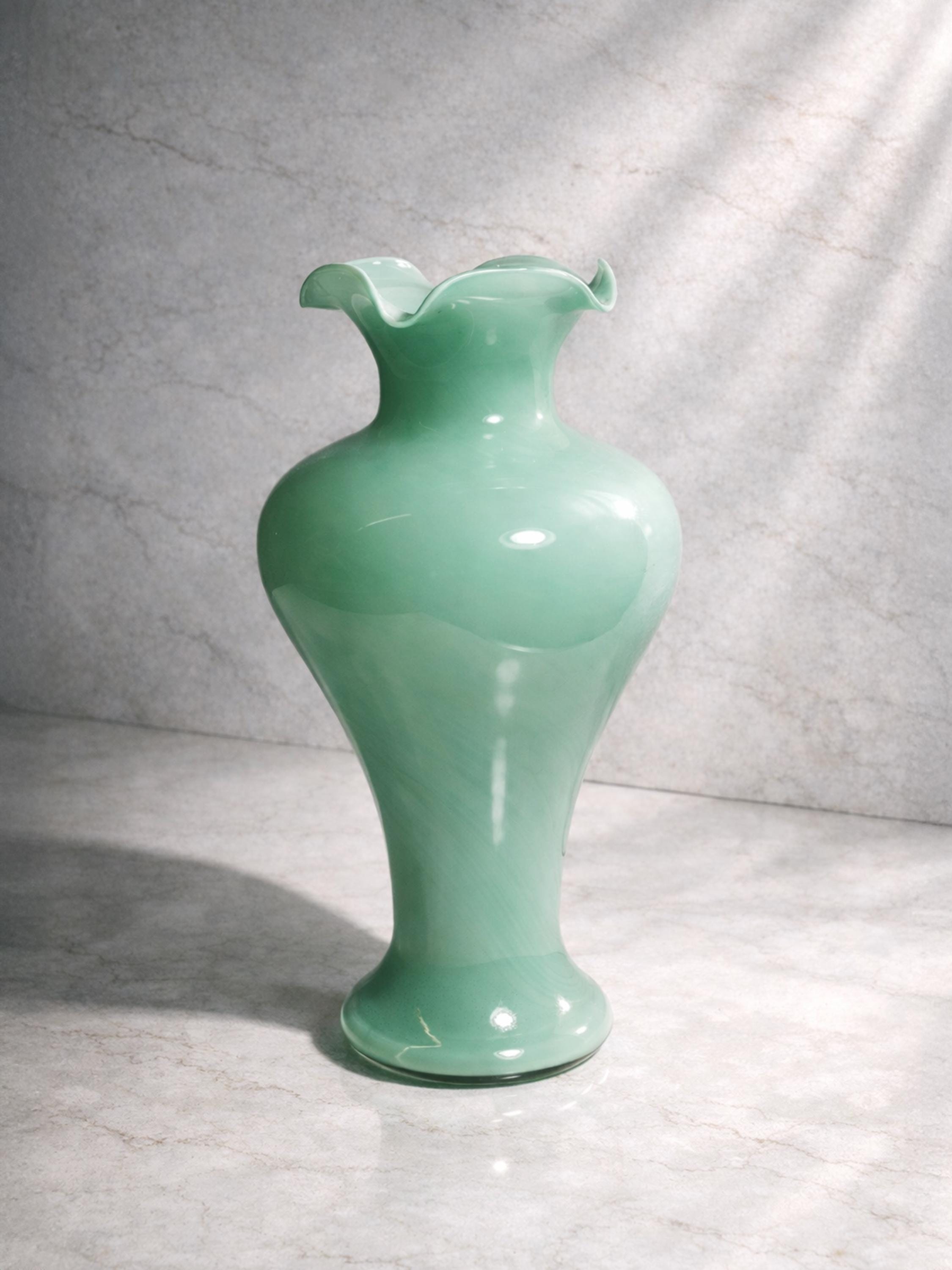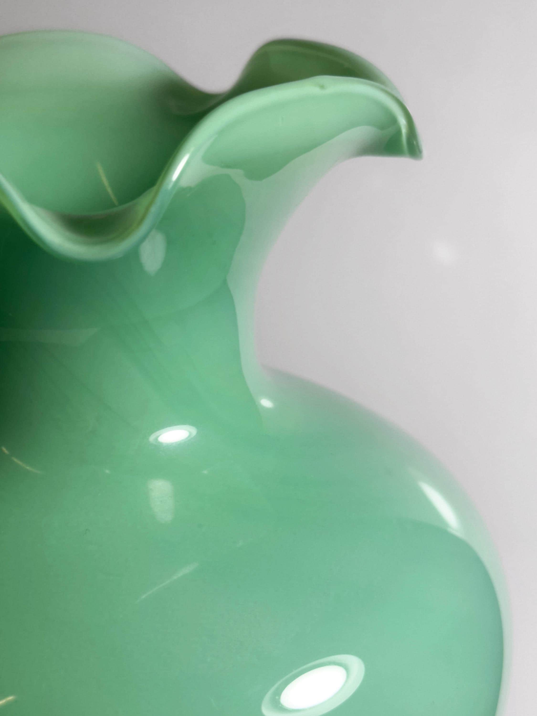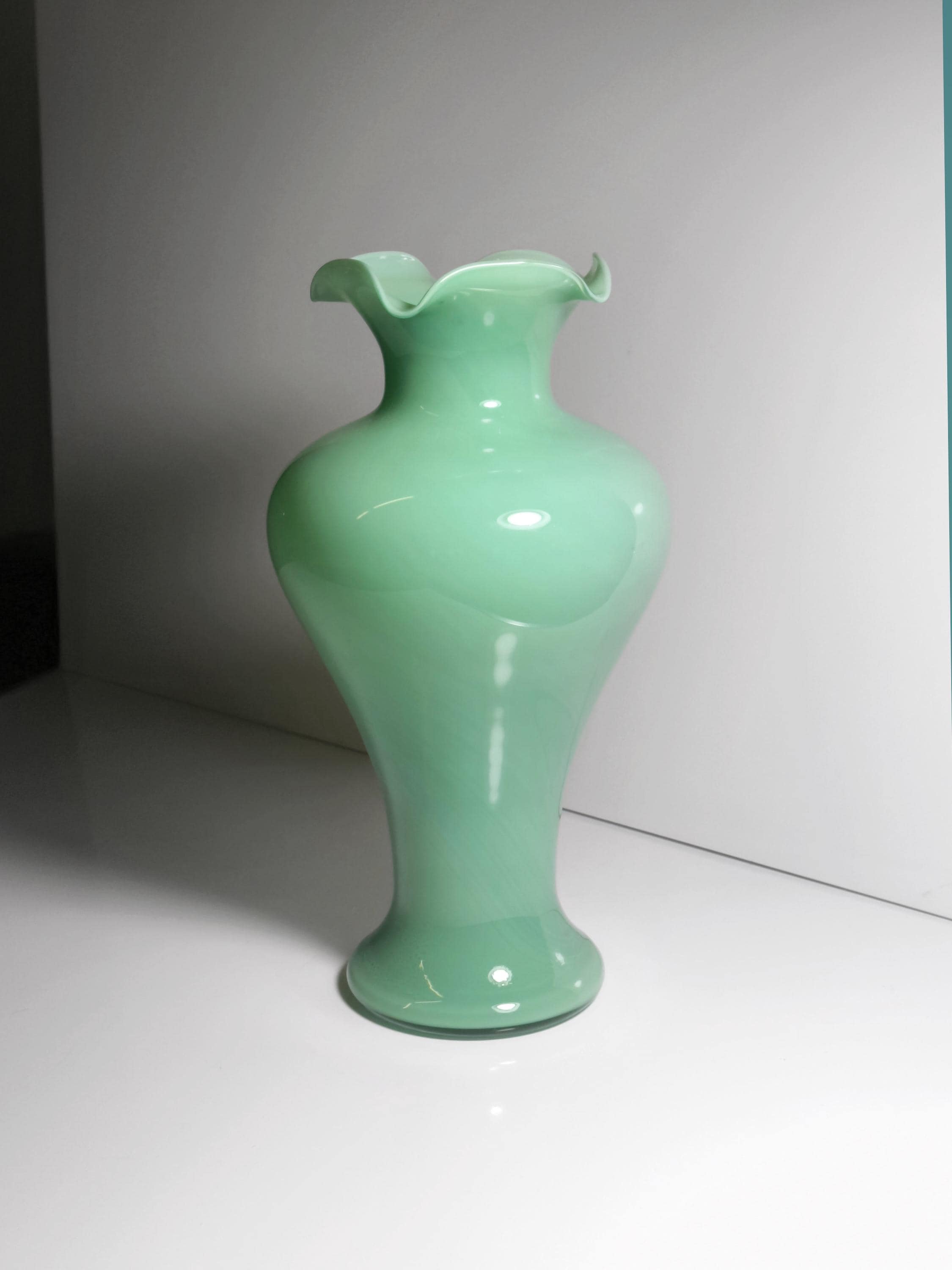 A stunning Murano glass vase from the 1950s. The jade-colored frosted glass has been beautifully shaped. The vase has a slender and elegant appearance, complemented by a scalloped rim. A beautiful, handcrafted piece, rarely found.